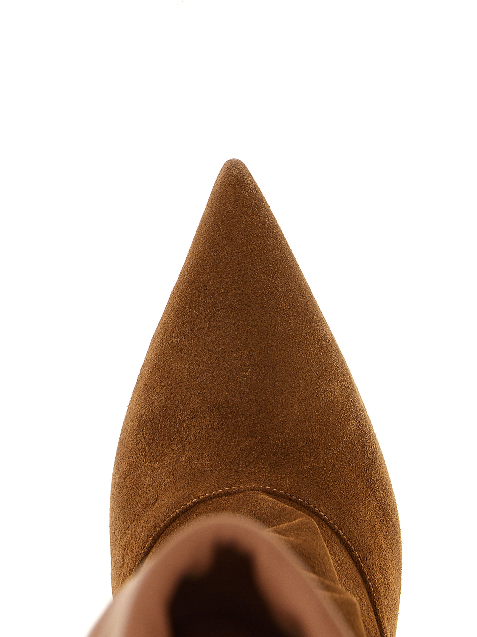 ‘Ines’ suede boots, pointed model, tone-on-tone smooth leather tube leg, heel, leather sole.