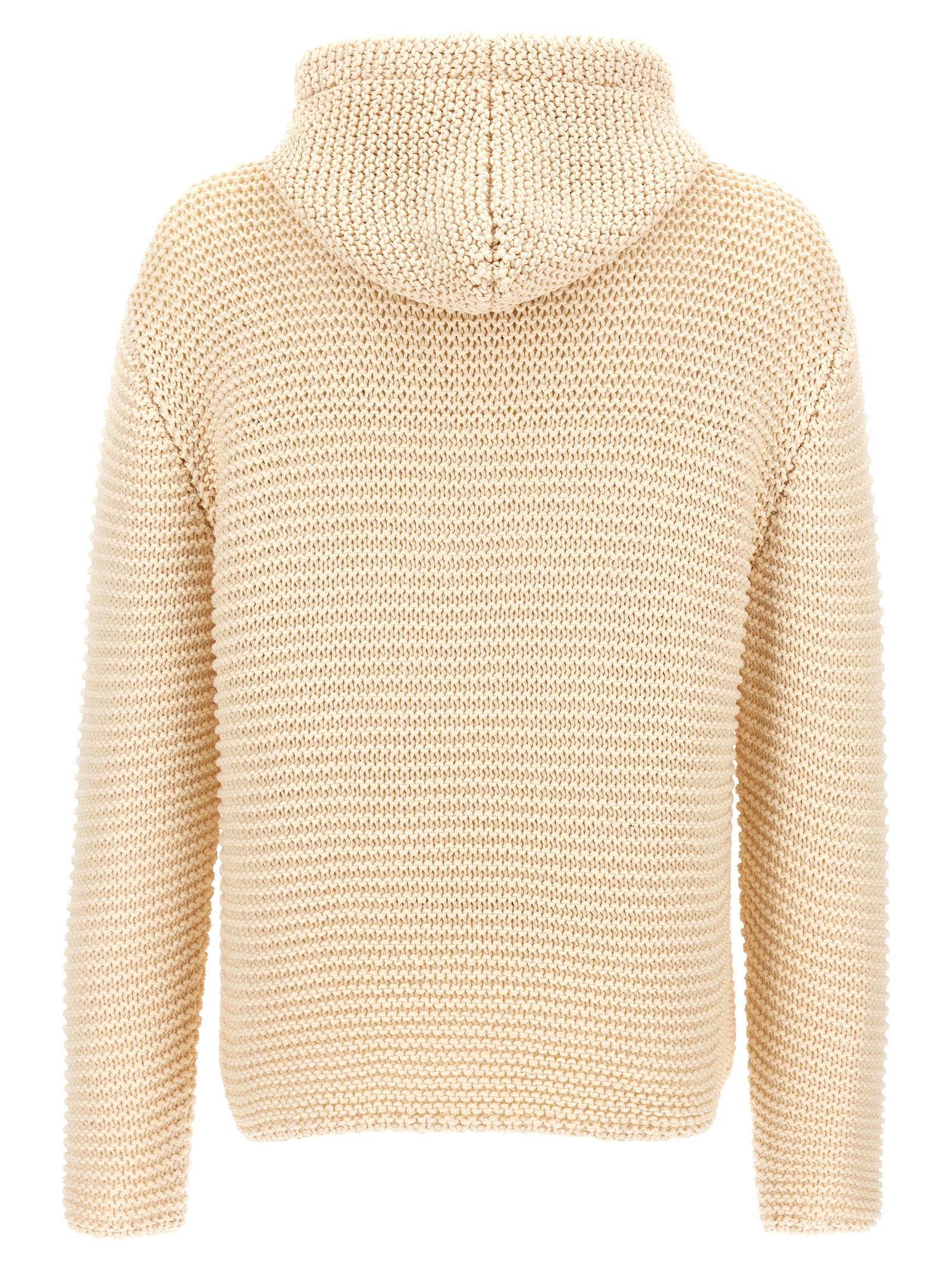 Knitted textured cotton hoodie with front inlaid logo, long sleeves with dropped shoulders.