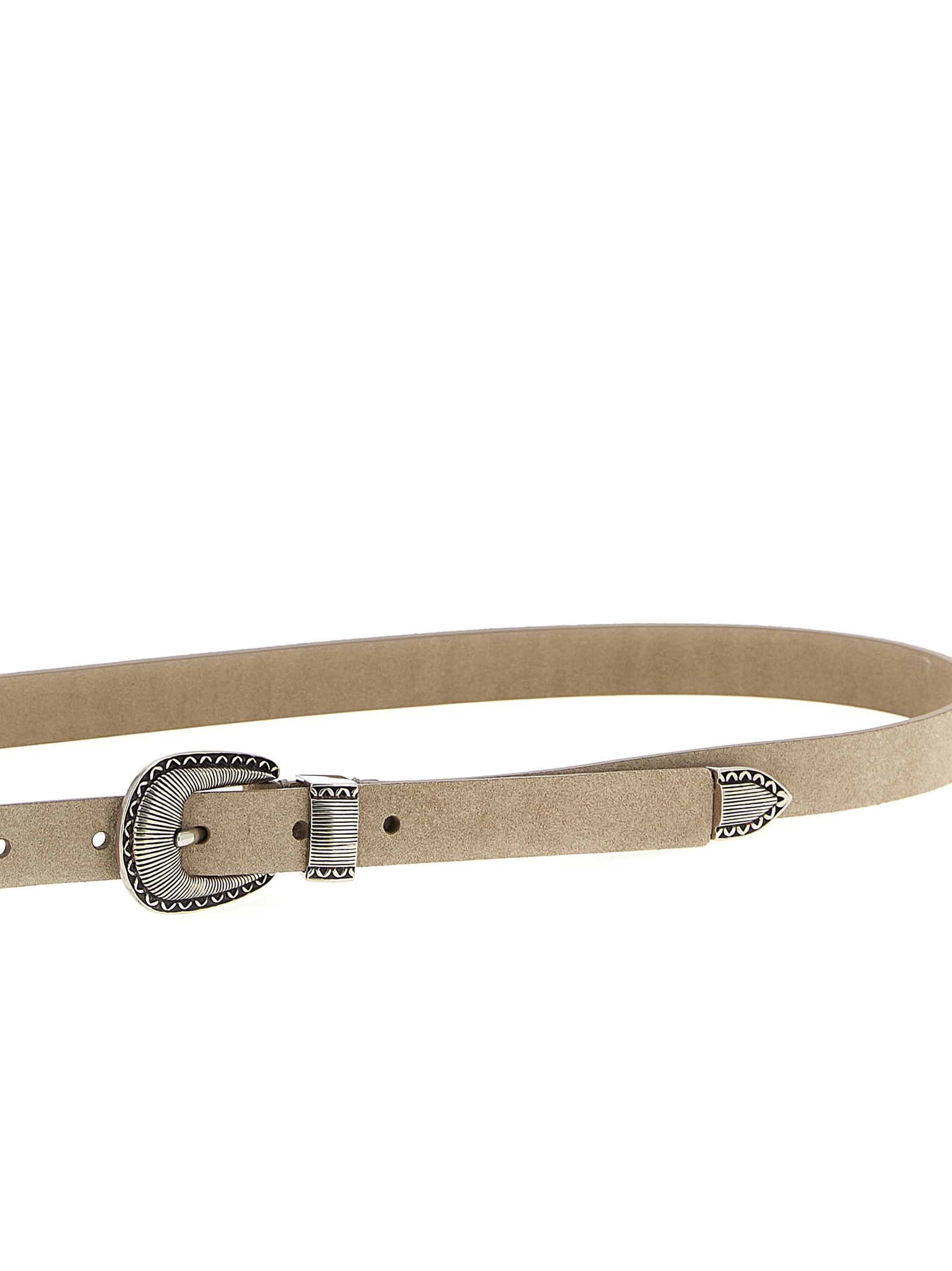 Inverted leather belt, double buckle and metal toe cap with embossed machining.