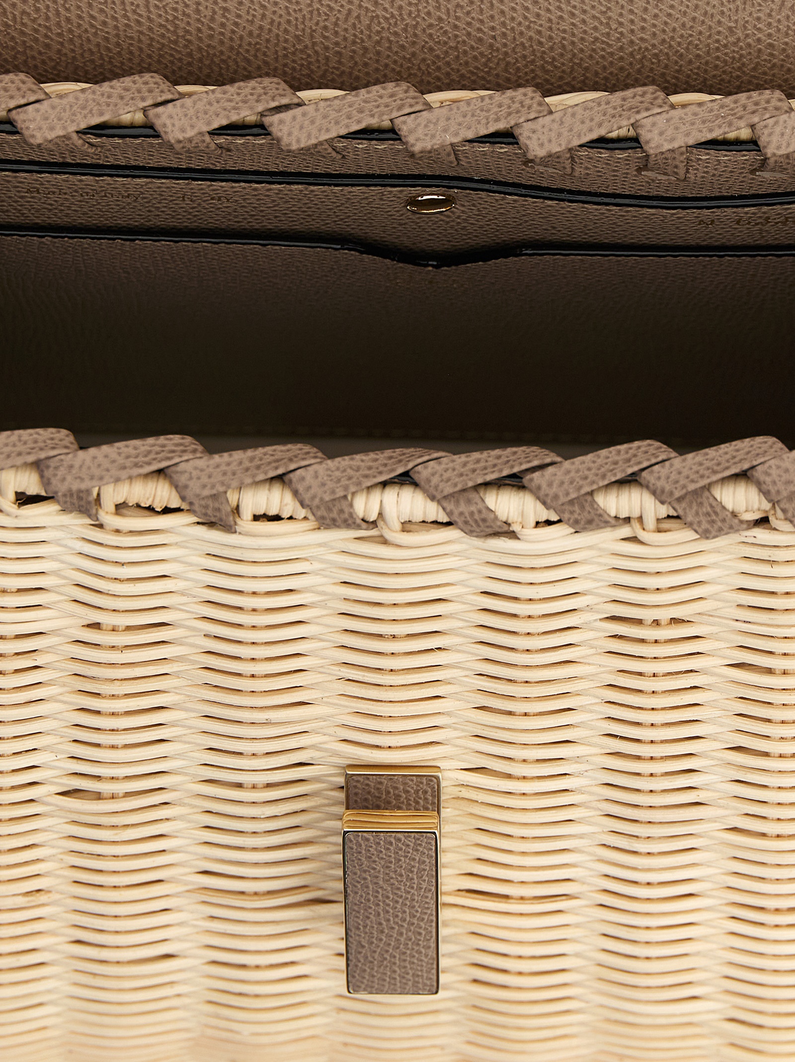 ‘Iside Vimini’ medium handbag in natural braided wicker and Millepunte calf leather, Costa Valextra piping, fixed handle, flap turn-lock closure, side gussets with snap button, rigid base with metal feet, adjustable and removable shoulder strap.
