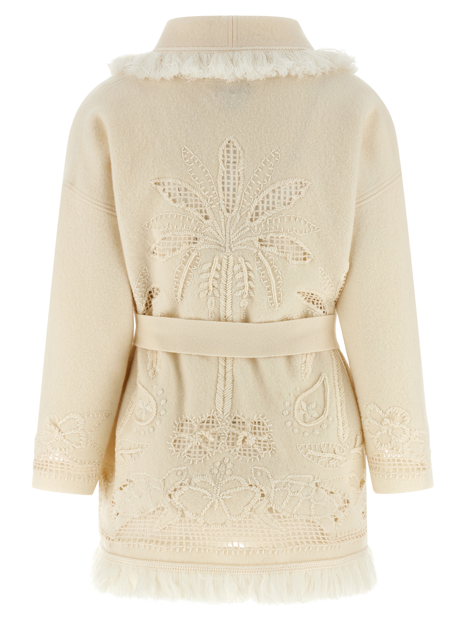 ‘Island’s Diary’ felted virgin wool cardigan embellished with hand-embroidered details reminiscent of Sangallo lace, dressing gown style with shawl neckline and frayed edges, long sleeves, pockets, removable matching belt.