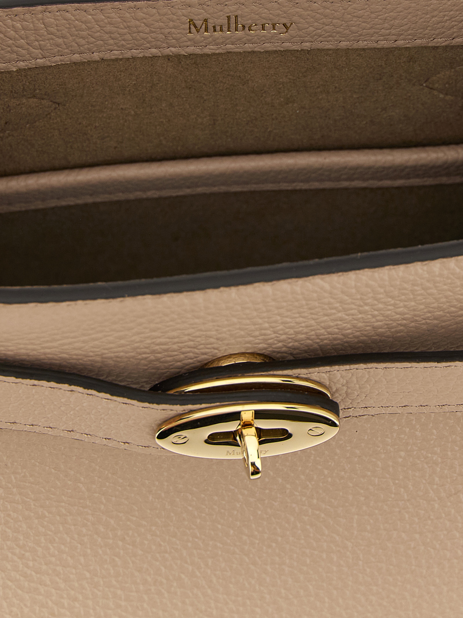Small ‘Islington’ bucket bag in hammered leather, front embossed logo, belt closure with metal Postman’s Lock, fixed handle, adjustable shoulder strap, and metal details.