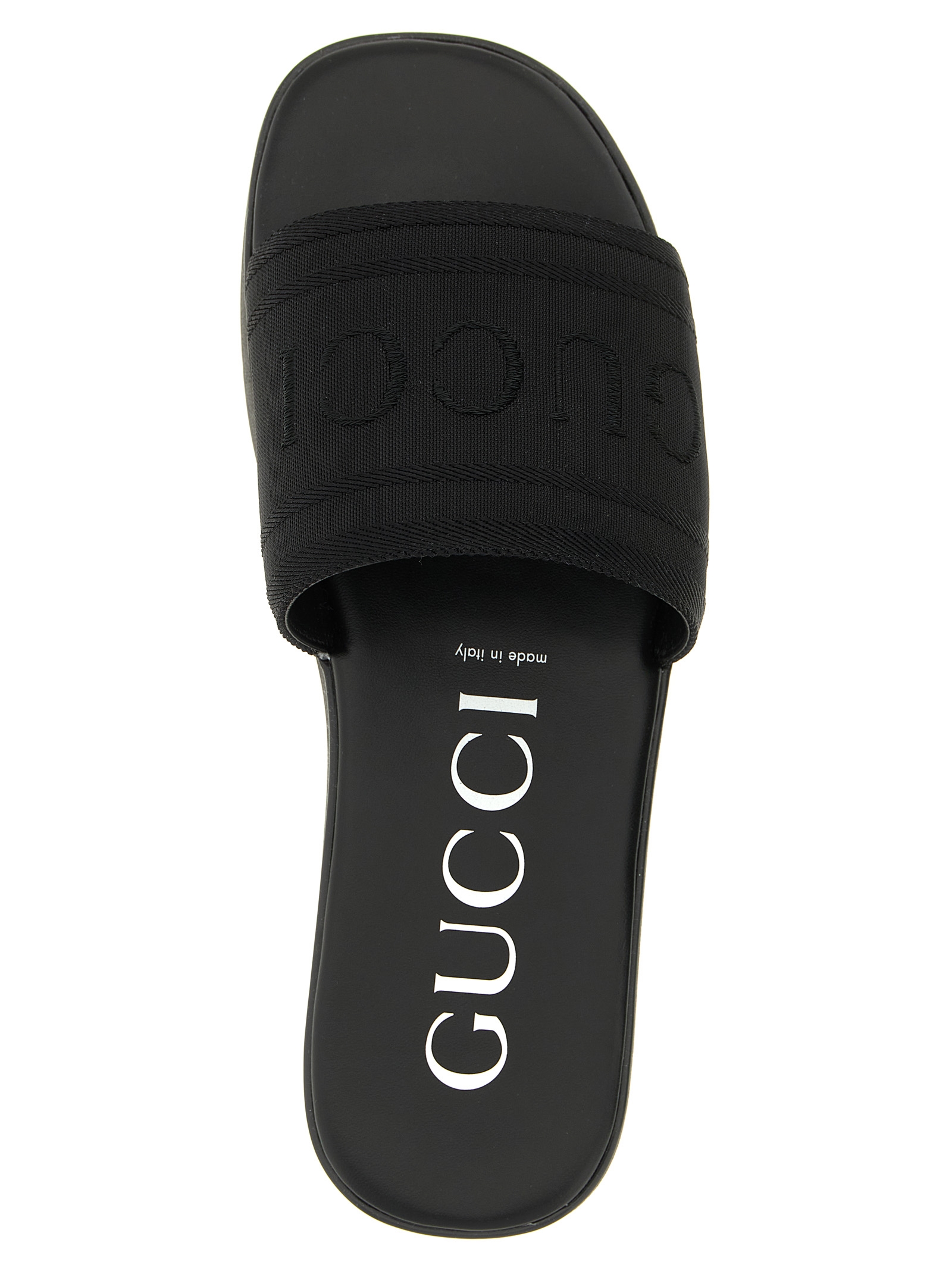 Fabric slides with tone-on-tone jacquard lettering logo, padded leather insole, GG rubber sole.