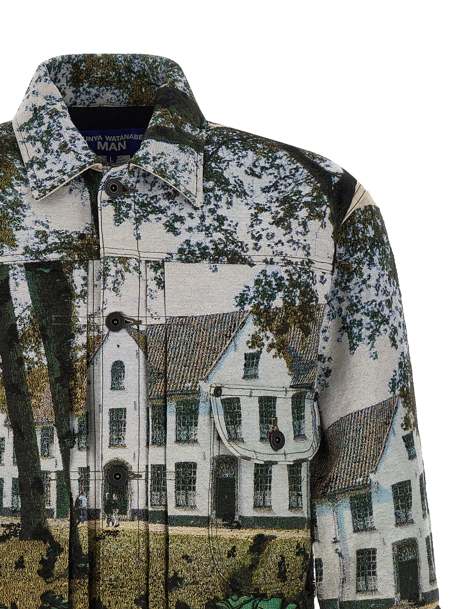 Cotton blend jacket with jacquard pattern, frayed details, front and back pincers, shirt collar, front metal button closure, pockets, long sleeves with cuffs, unlined.
