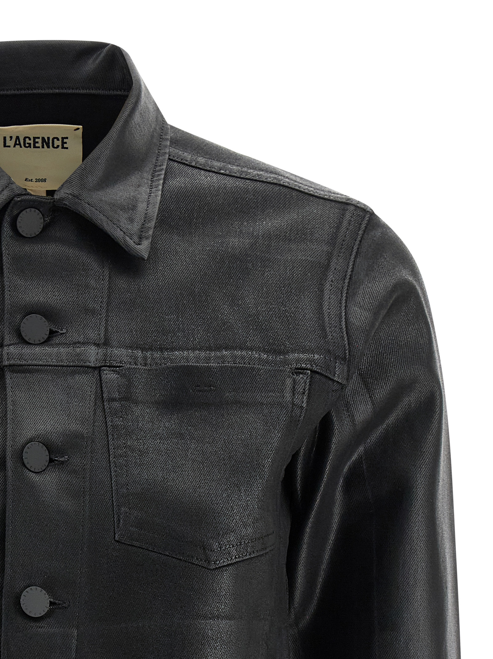 ‘Janelle’ thin and subtly shiny cotton denim jacket, crop style with hourglass silhouette, shirt collar, front button closure, pockets, 3/4 sleeves with turn-up on the cuffs, raw cut hem.