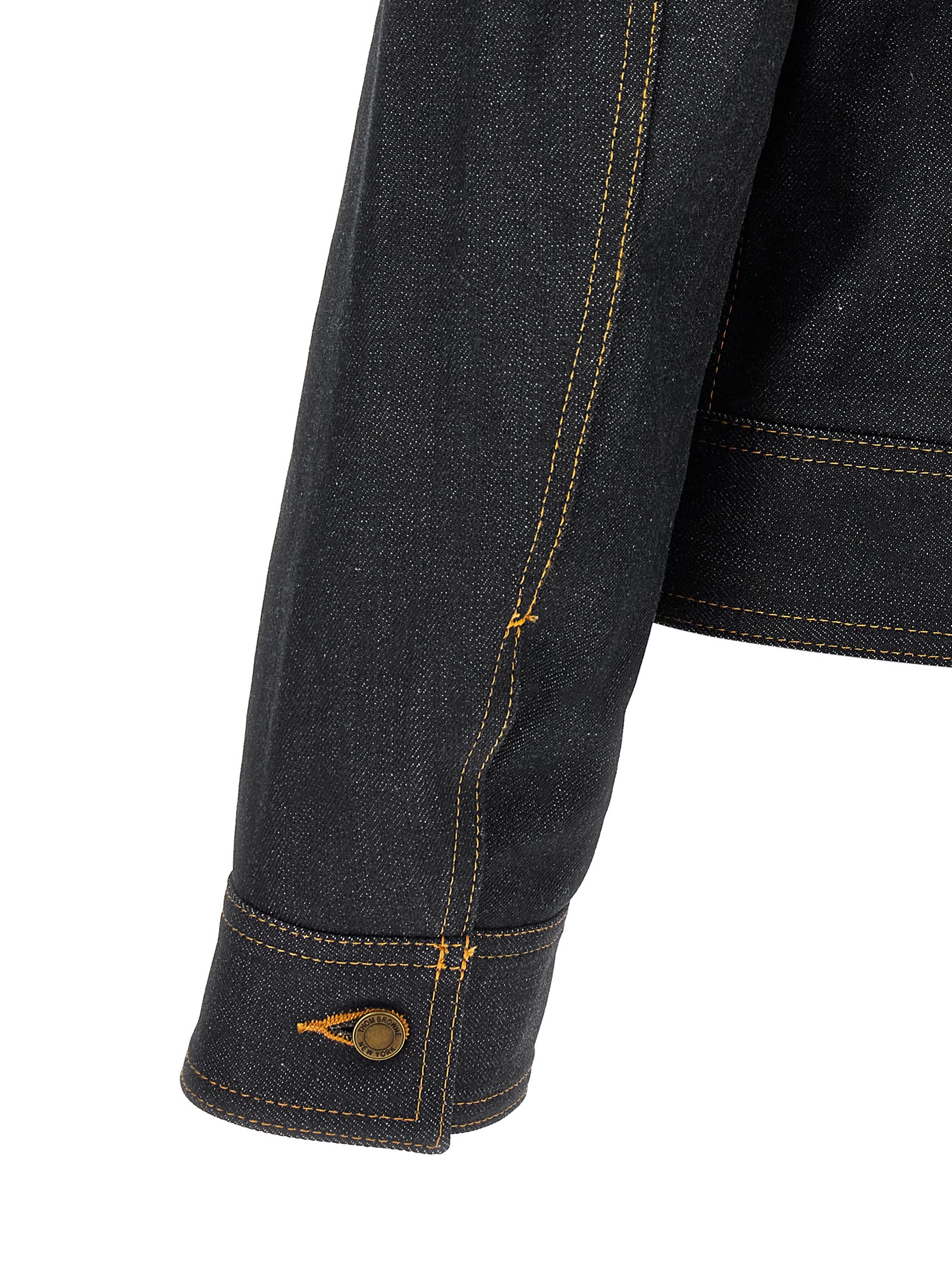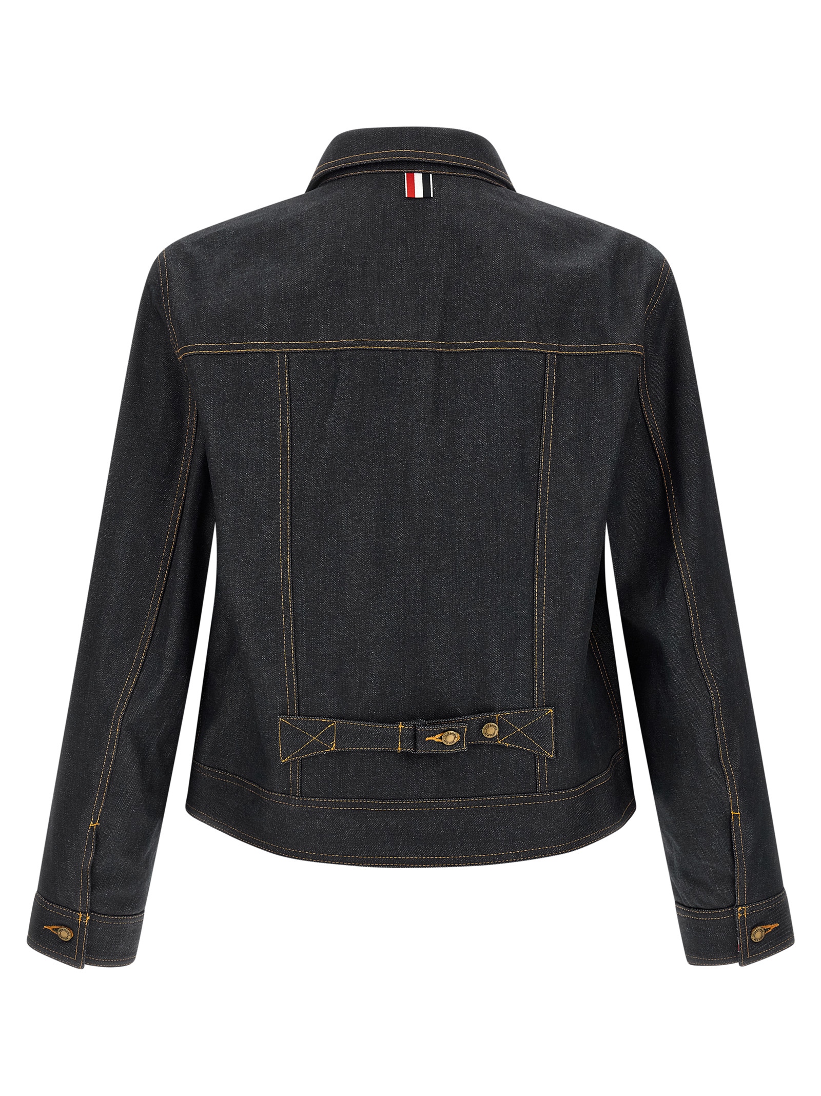 Japanese selvedge cotton denim jacket with contrast stitching, flared silhouette, shirt collar, front button closure, pockets, long cuffed sleeves.