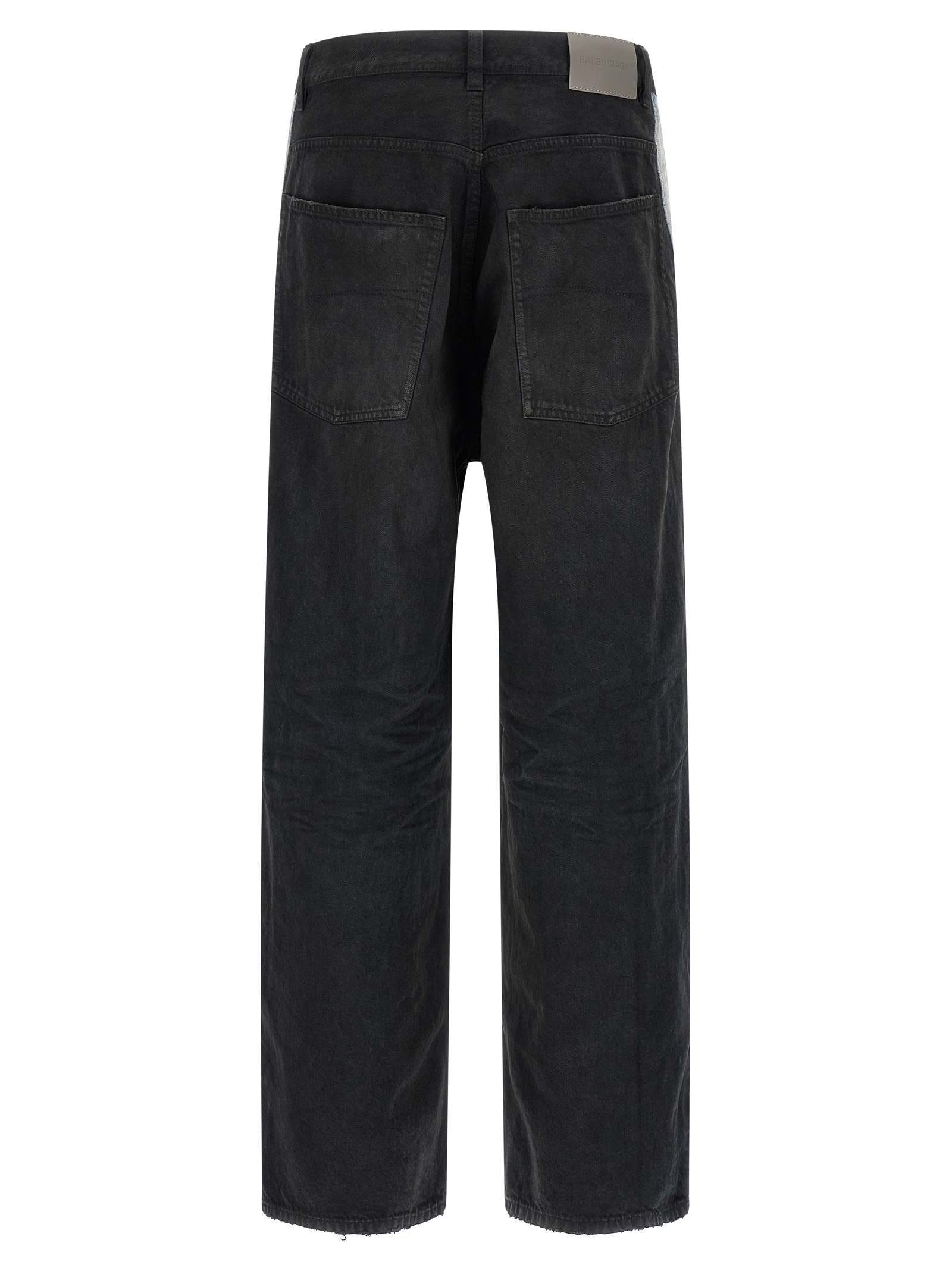 Used-effect Japanese twill jeans with side cotton denim inserts, contrast ‘Loop Sports Icon’ embroidery on the front, wide flared leg, zip and button closure, five pockets, back logo tag.