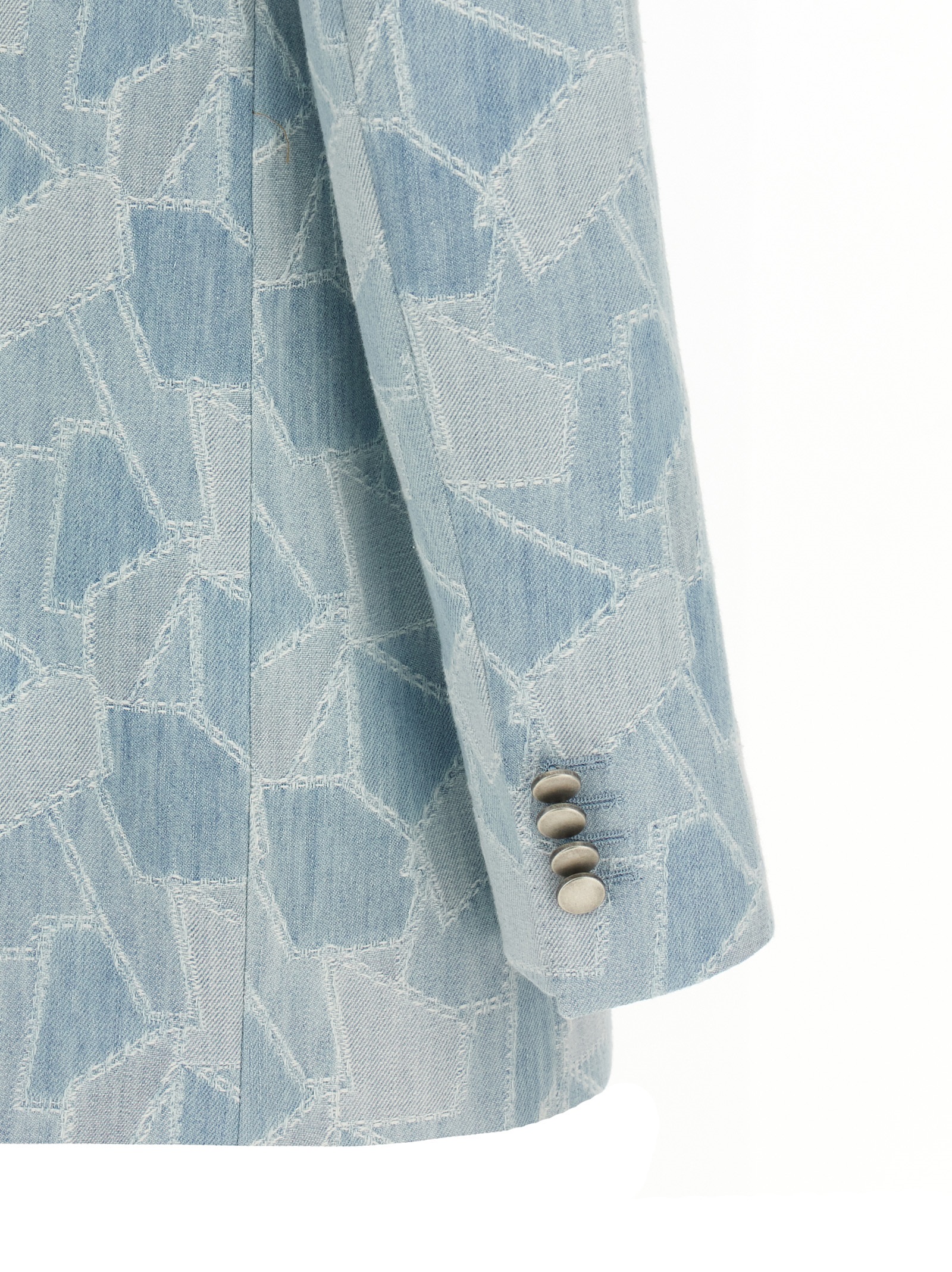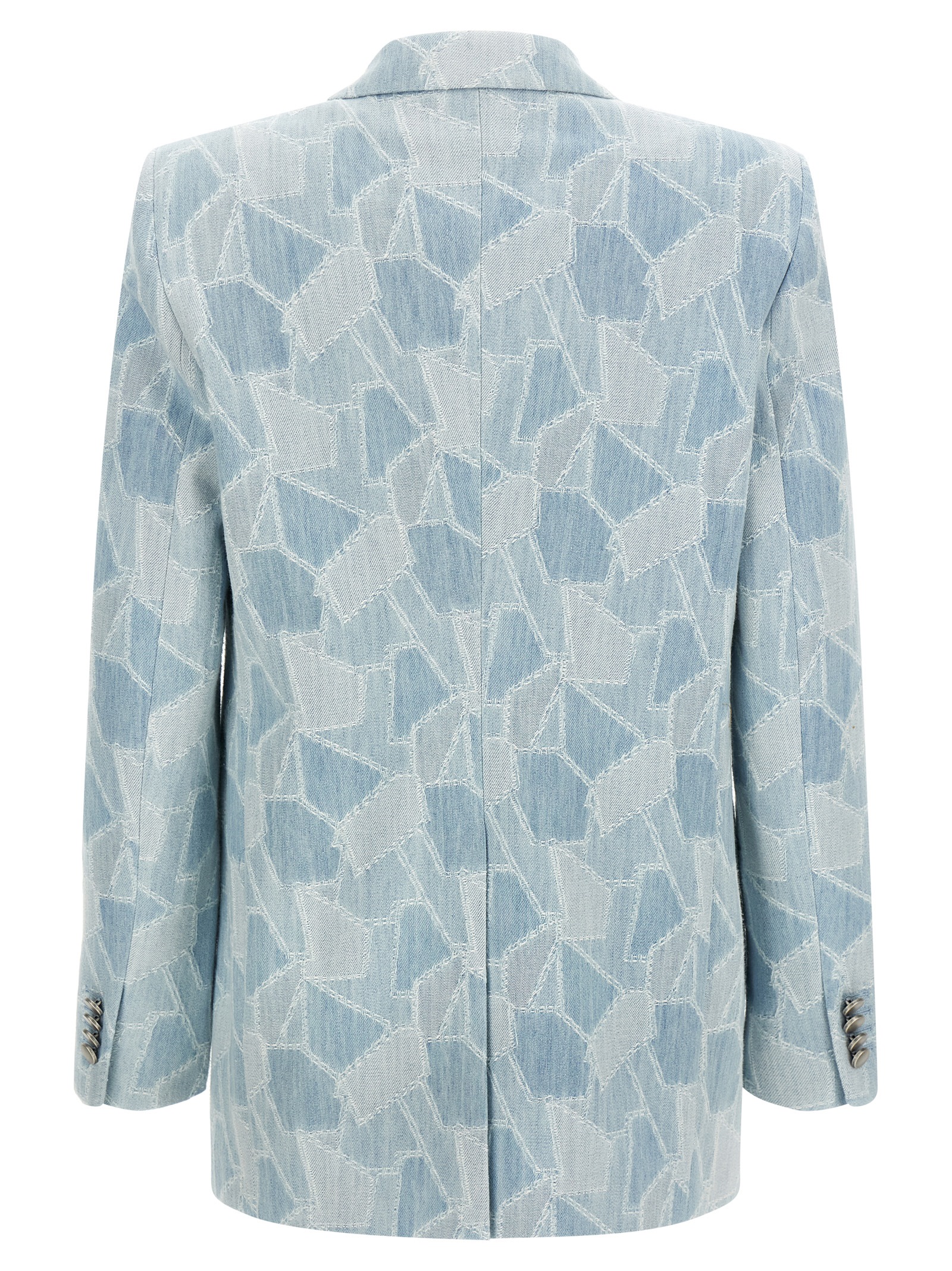 ‘Jasmine’ double-breasted blazer in cotton denim with patchwork construction, front metal button closure, peak lapels, chest pocket, flap pockets, structured shoulder strap, long sleeves, back split, cupro lining.