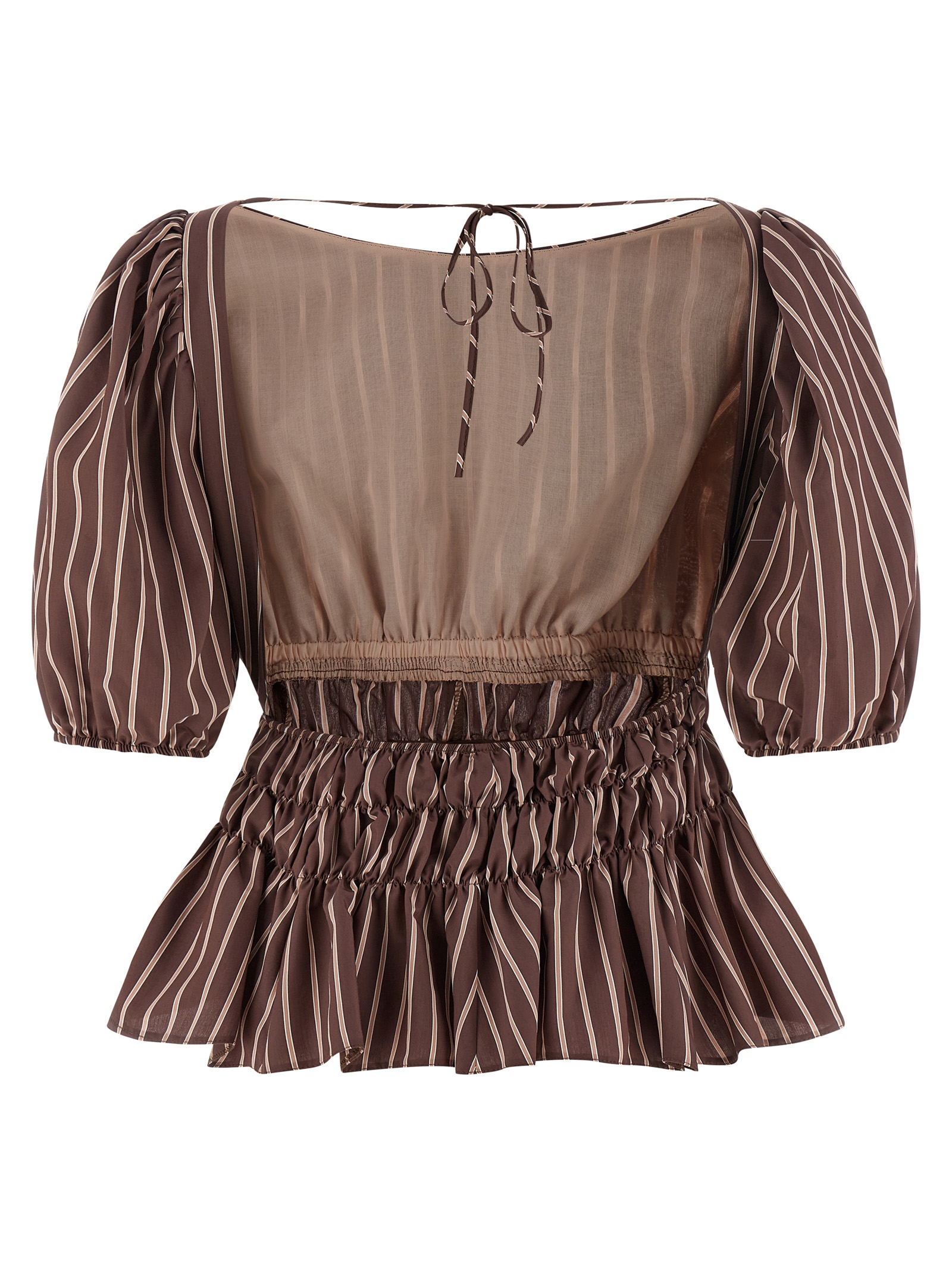 ‘Jeanette’ top in flowing viscose fabric dyed in yarn with vertical stripes, boat neckline with tie at the back, open back, elasticated gathered waistband, asymmetrical hem with pleats, short balloon sleeves with elasticated cuffs.