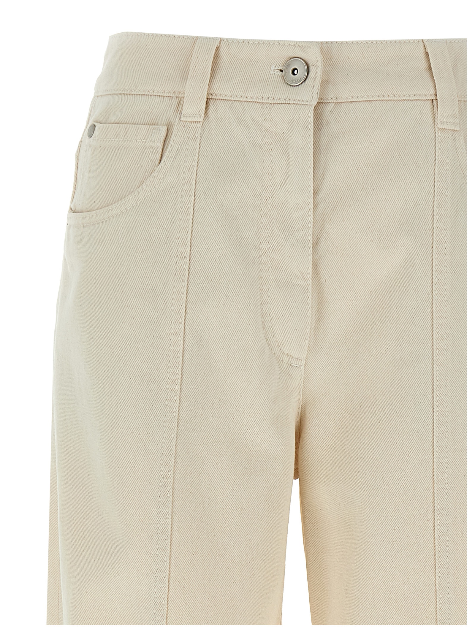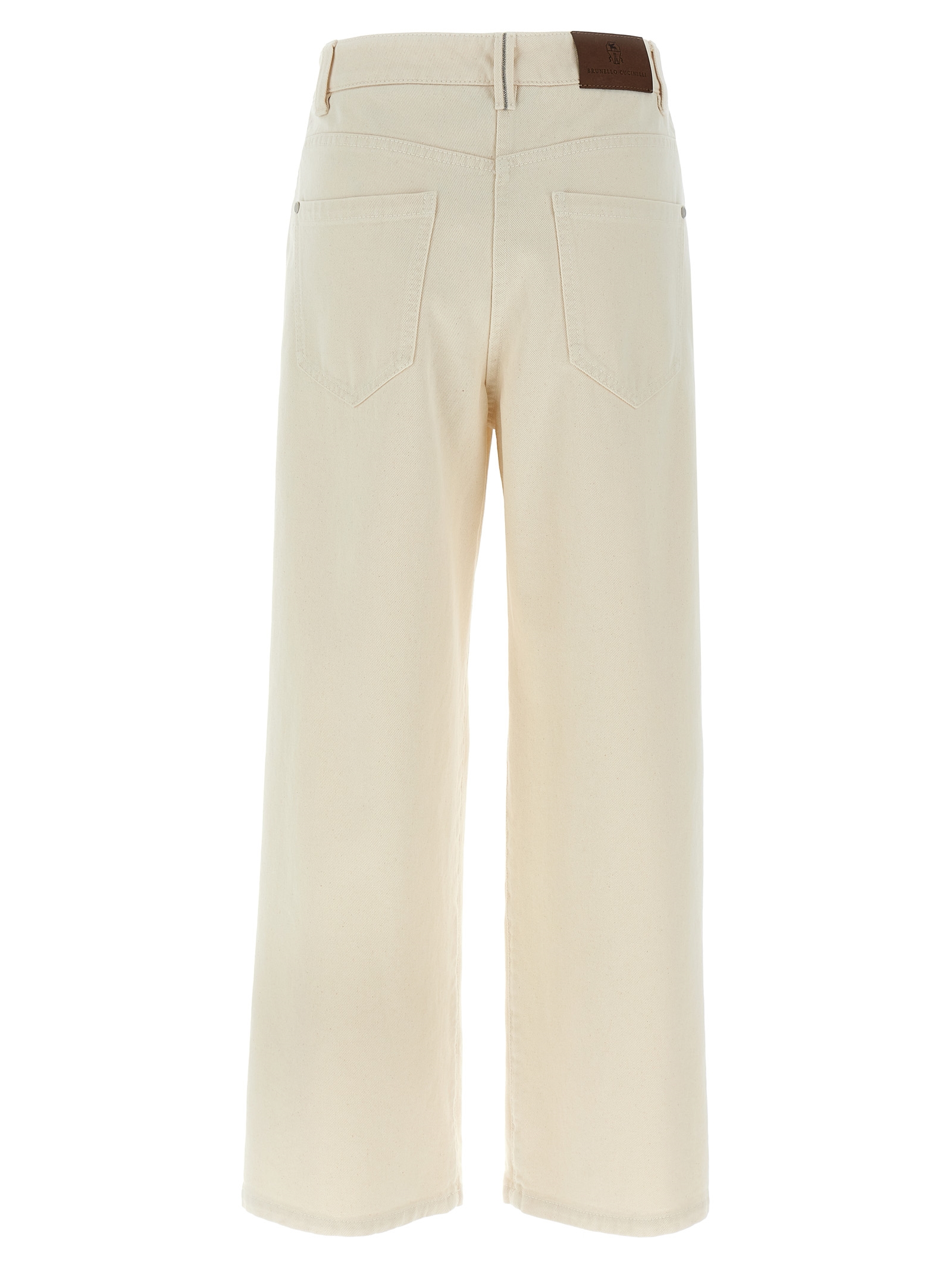 Garment-dyed cotton denim jeans with back Monile detail, five pockets, wide leg with central stitching, zip and button closure.