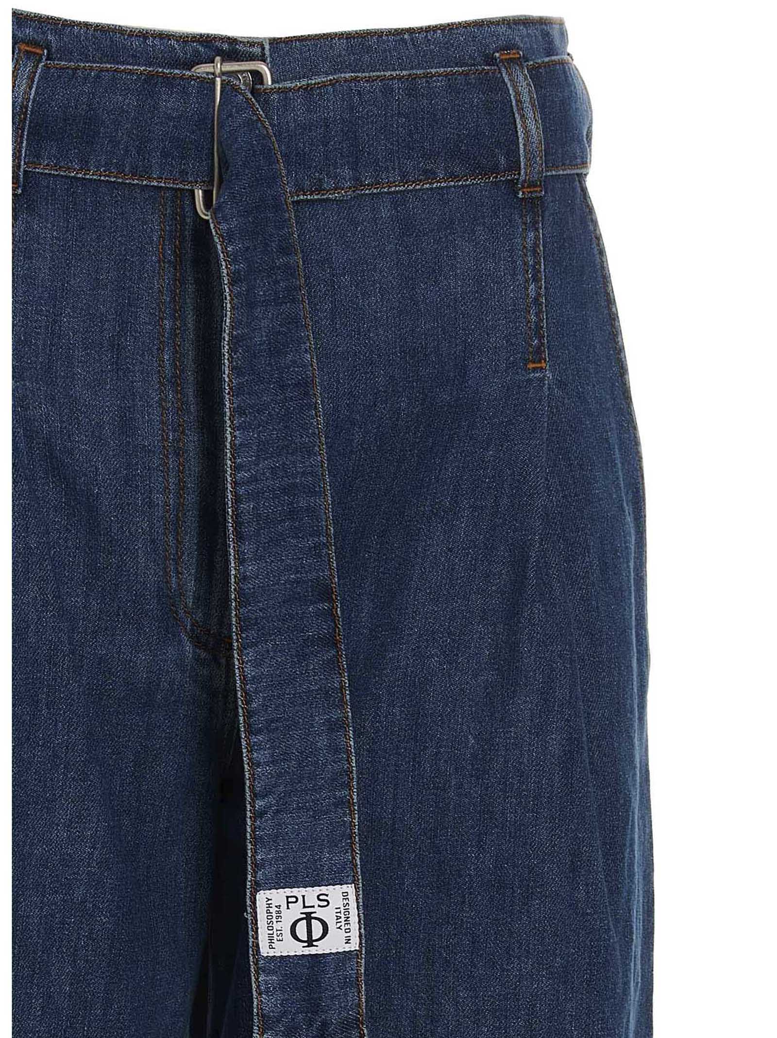 Cotton denim jeans with removable waist belt, zip and button closure, front pleats, pockets and a loose leg.