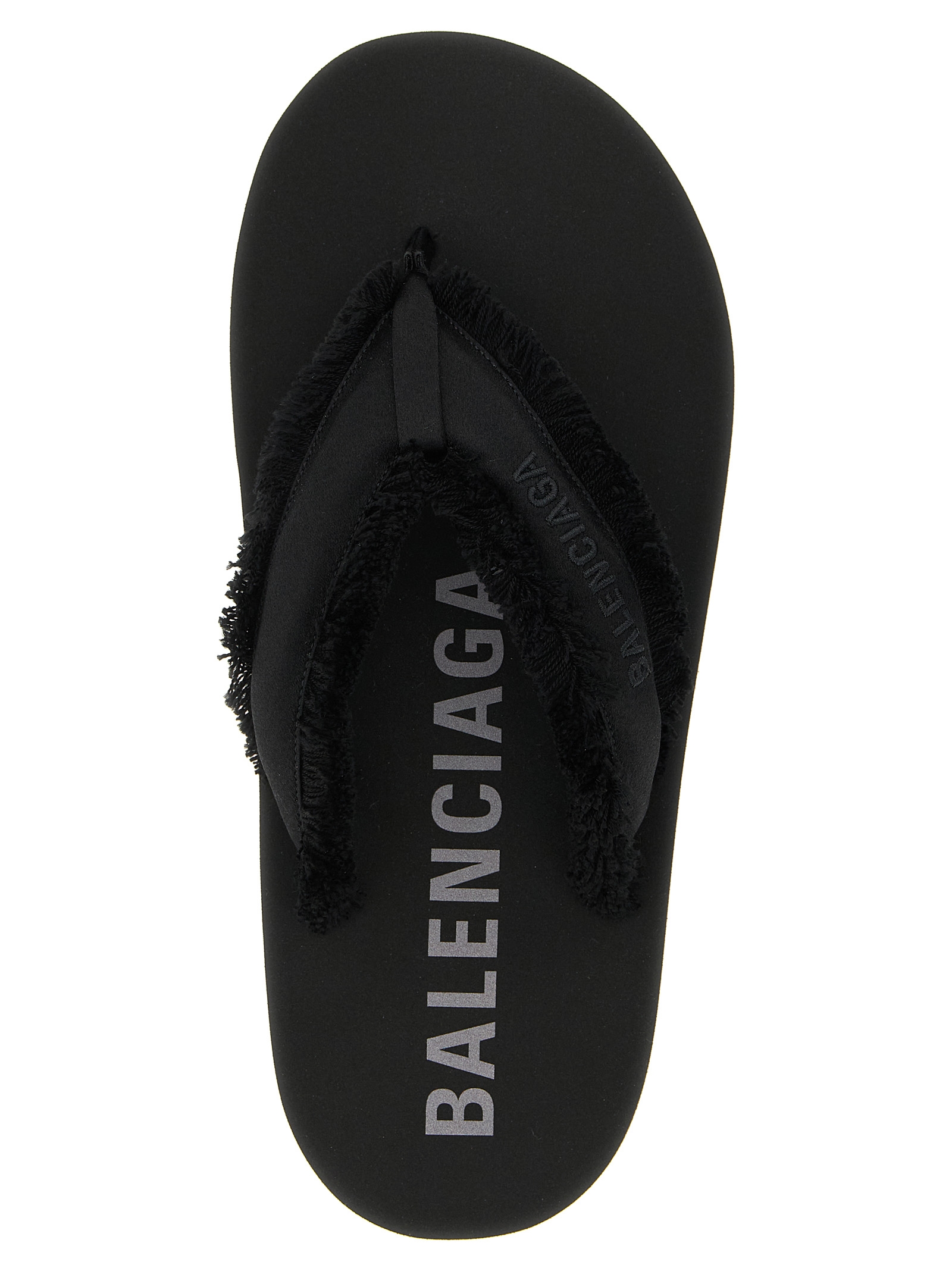 ‘Jet Lag’ brushed satin sandals with flip-flops style, rounded toe, padded upper with fringes and tone-on-tone lettering logo embroidery, platform, TPU sole.