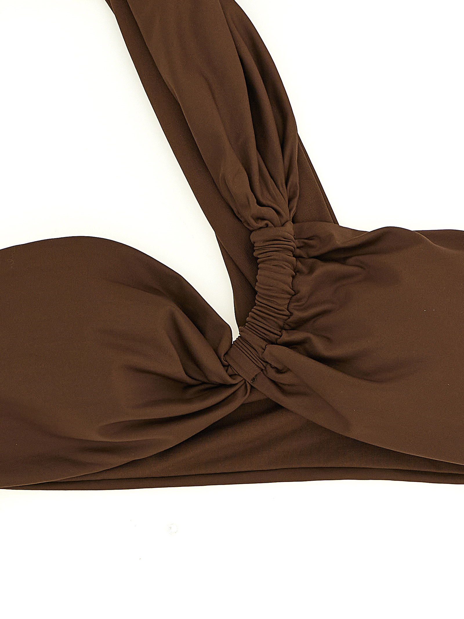 Lycra bikini, one-shoulder top with crossed band on the breast, tie to tie behind the neck with metal jewel detail with hammered texture, high waist bottoms.