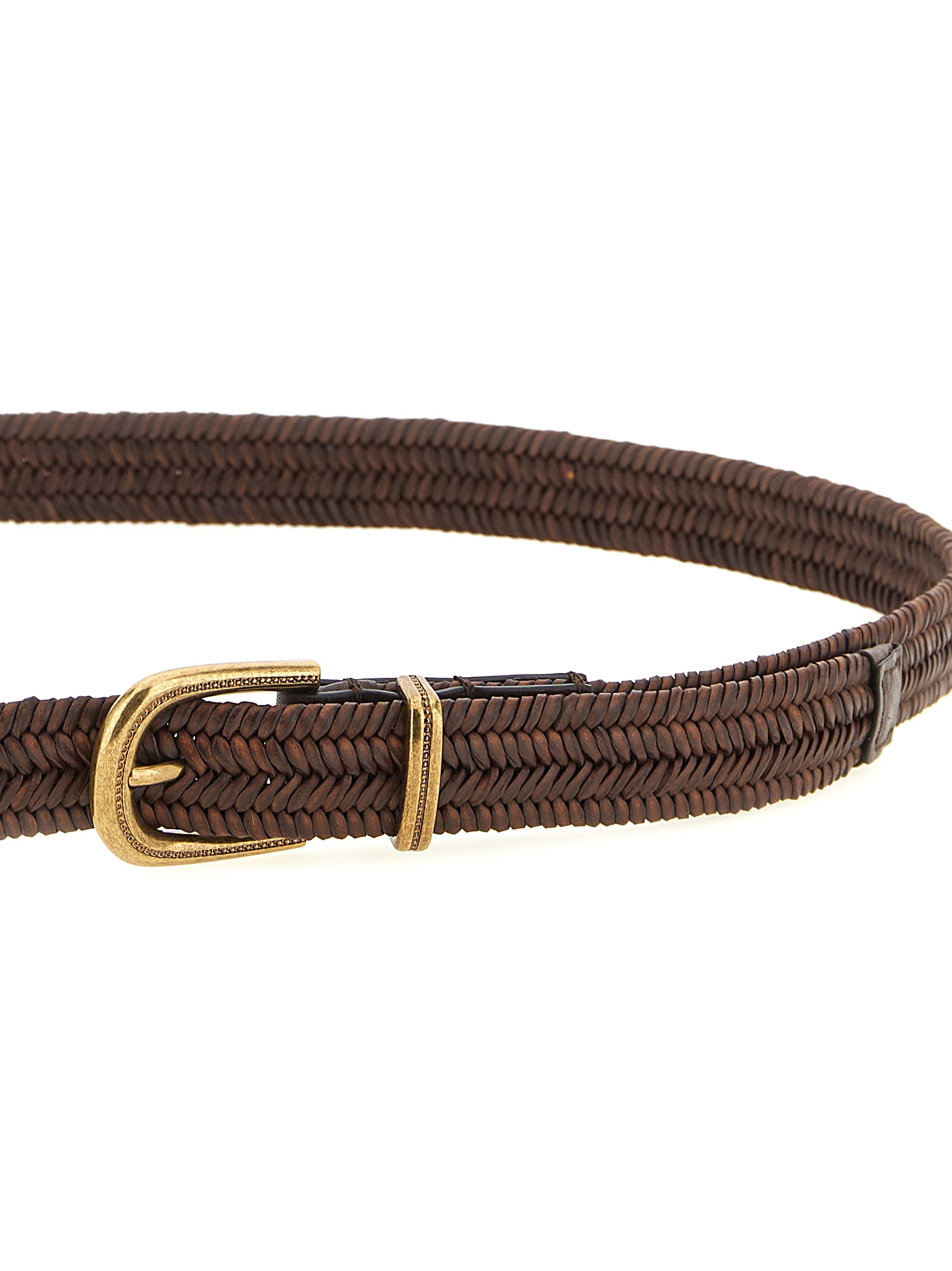 Braided stretch leather belt, antique-effect metal buckle and loop with Monile detail.
