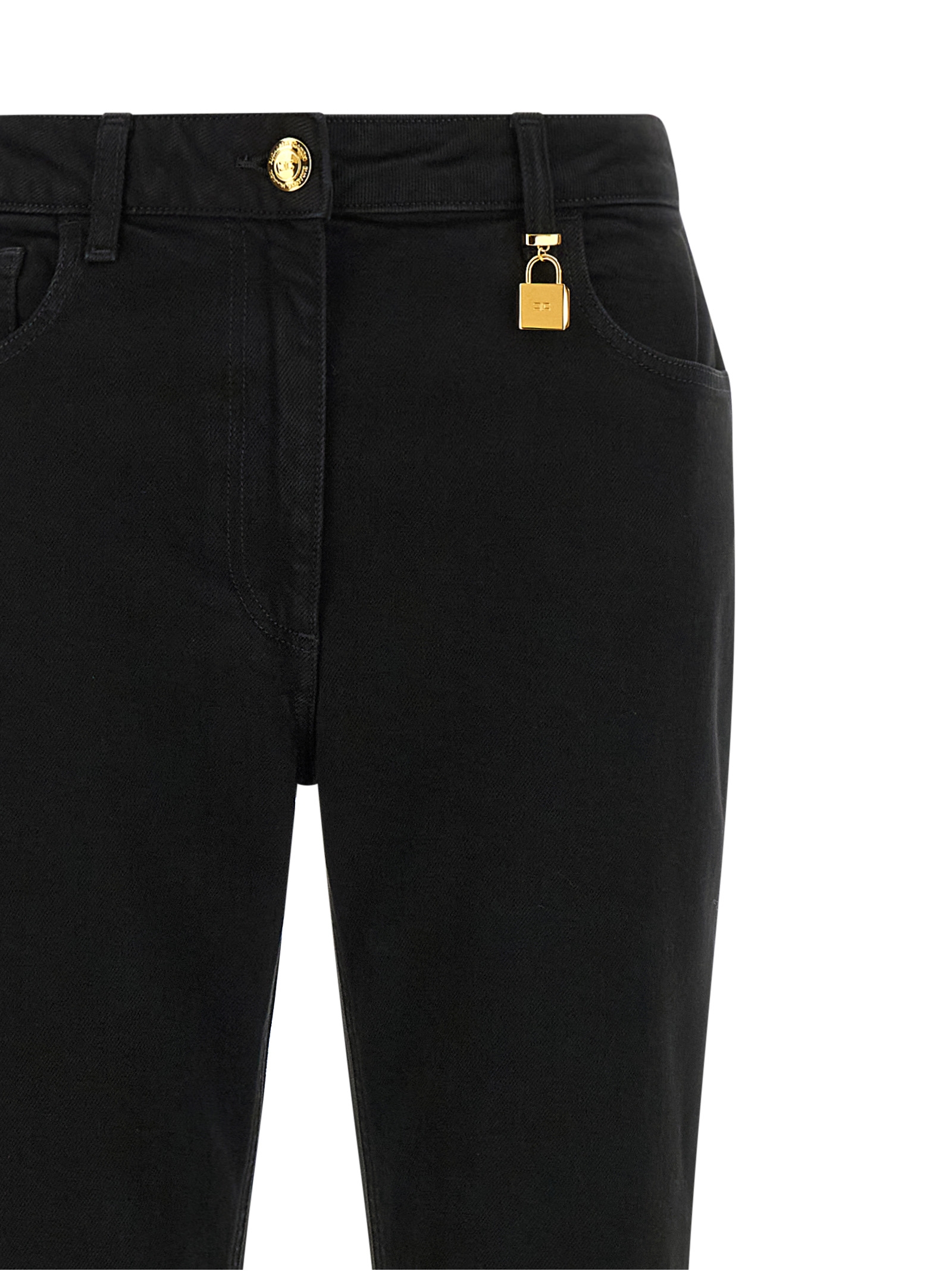 Garment-dyed cotton denim jeans, front metal jewel padlock detail, mid waist, zip and button closure, five pockets.