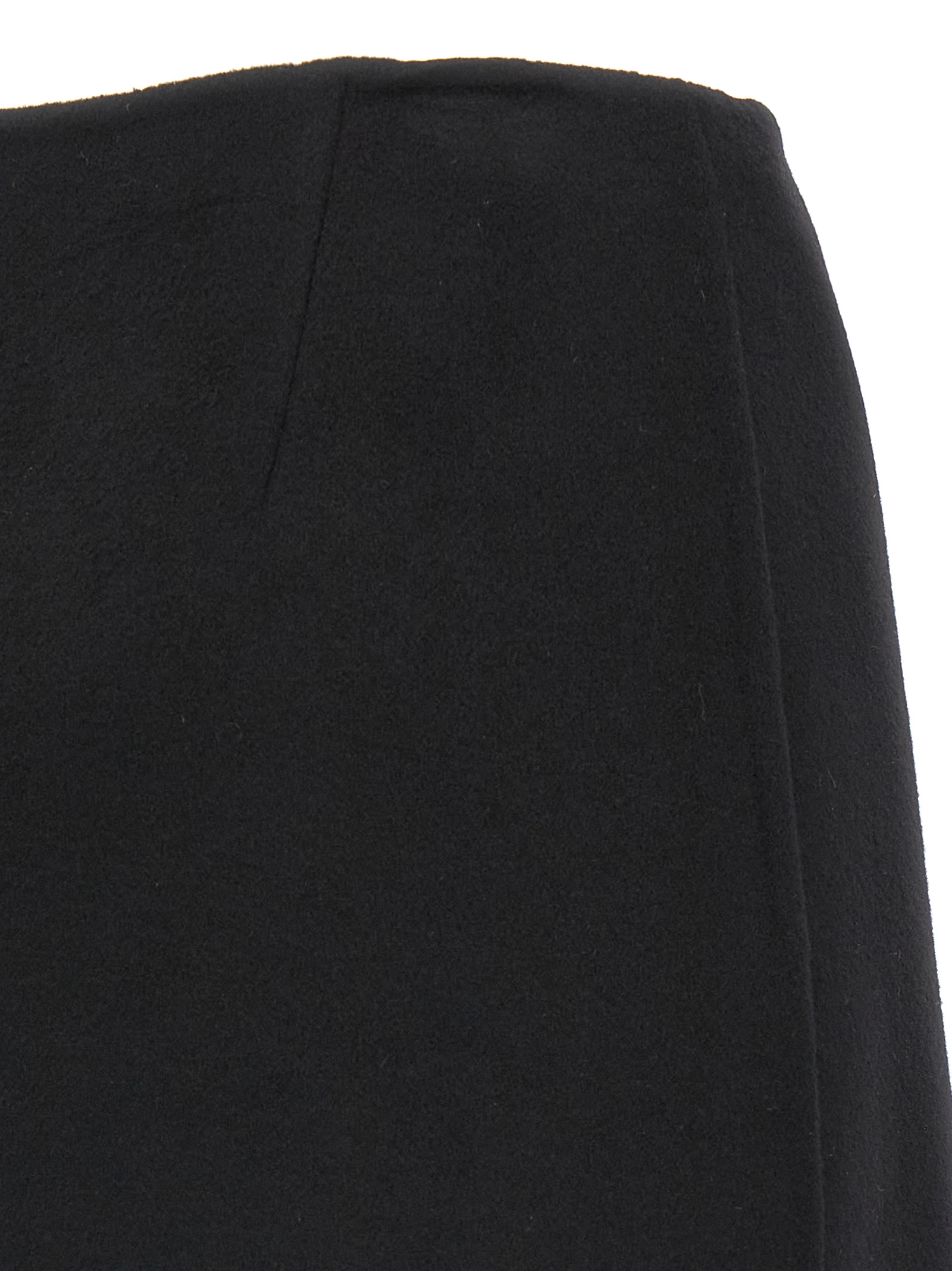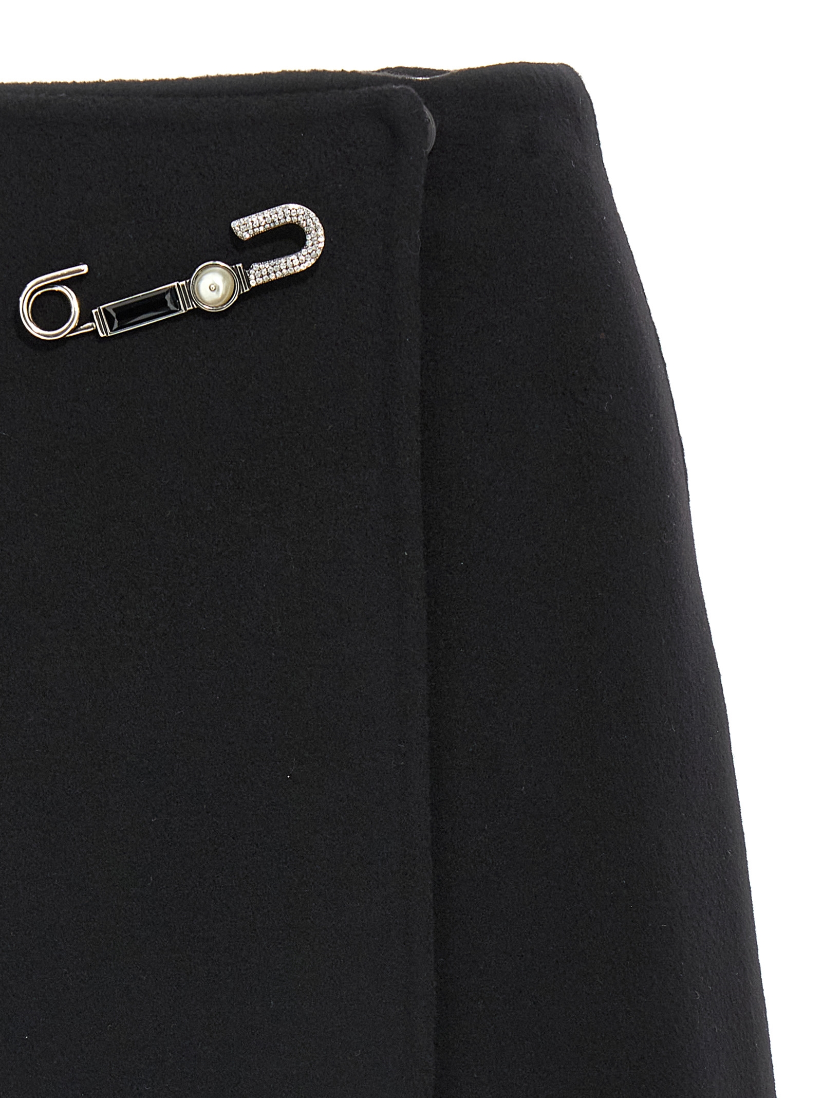Virgin wool mini skirt, wallet style with snap button closure and removable jewel brooch.