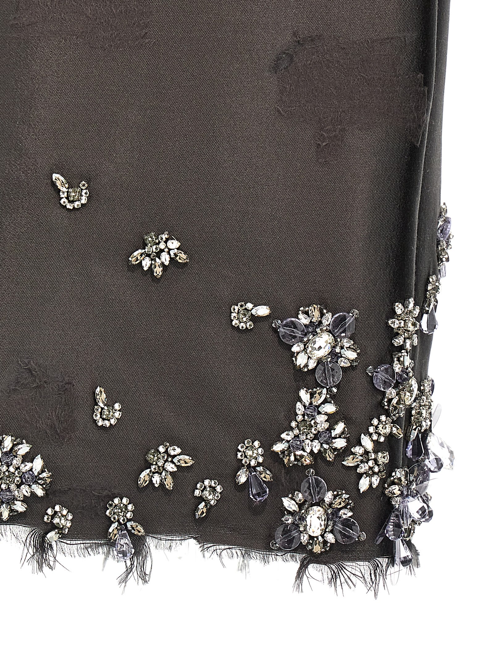 Silk and wool blend skirt with used effect details, jewel applications, raw cut, side zip closure, underskirt.