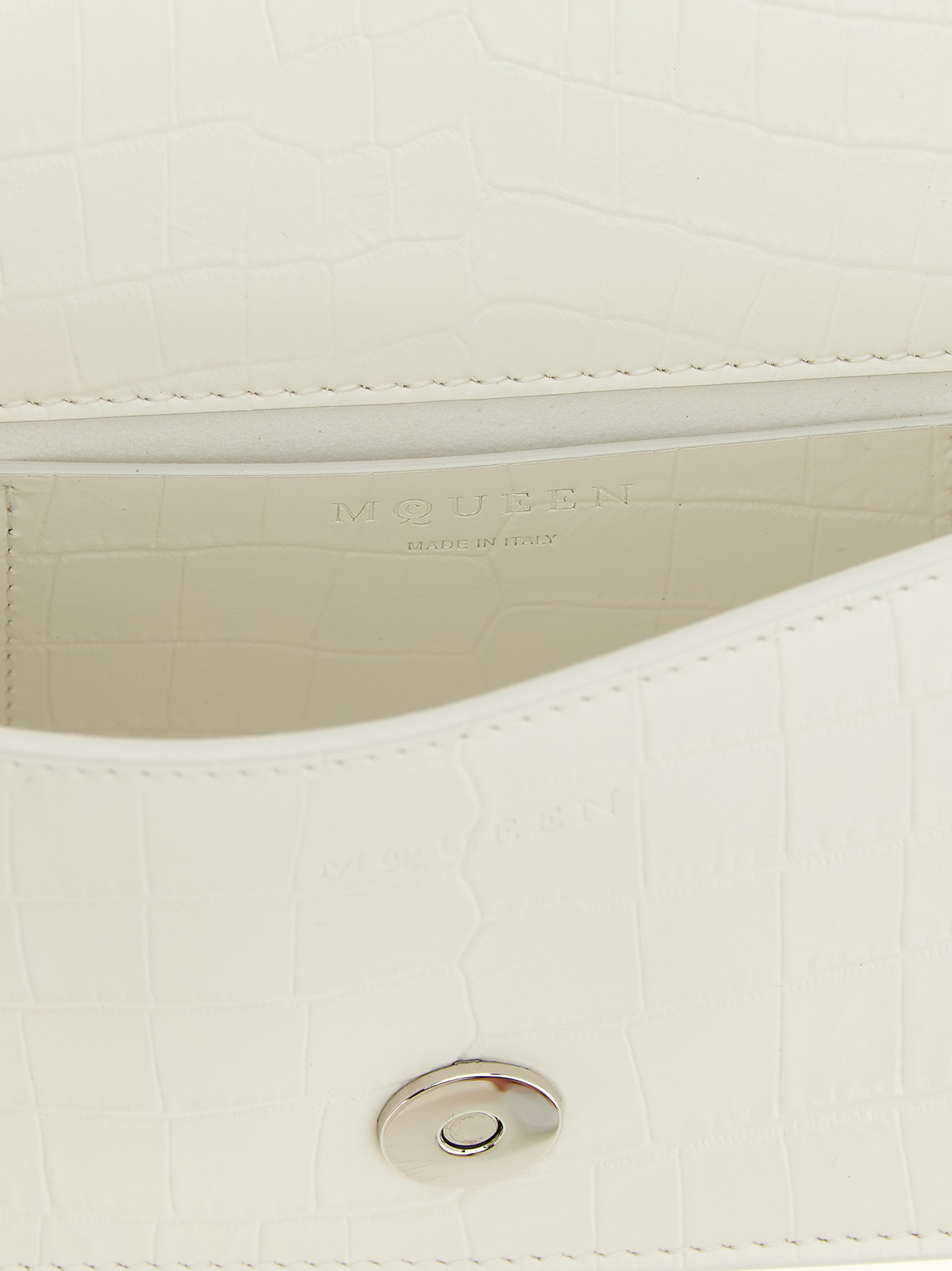 ‘Jewelled’ mini shoulder bag in crocodile-effect embossed print calf leather with semi-matte finish, magnetic flap closure with ‘Knuckle’ metal detail with the iconic ‘Skull’ with crystals, fixed chain handle, adjustable and removable shoulder strap.