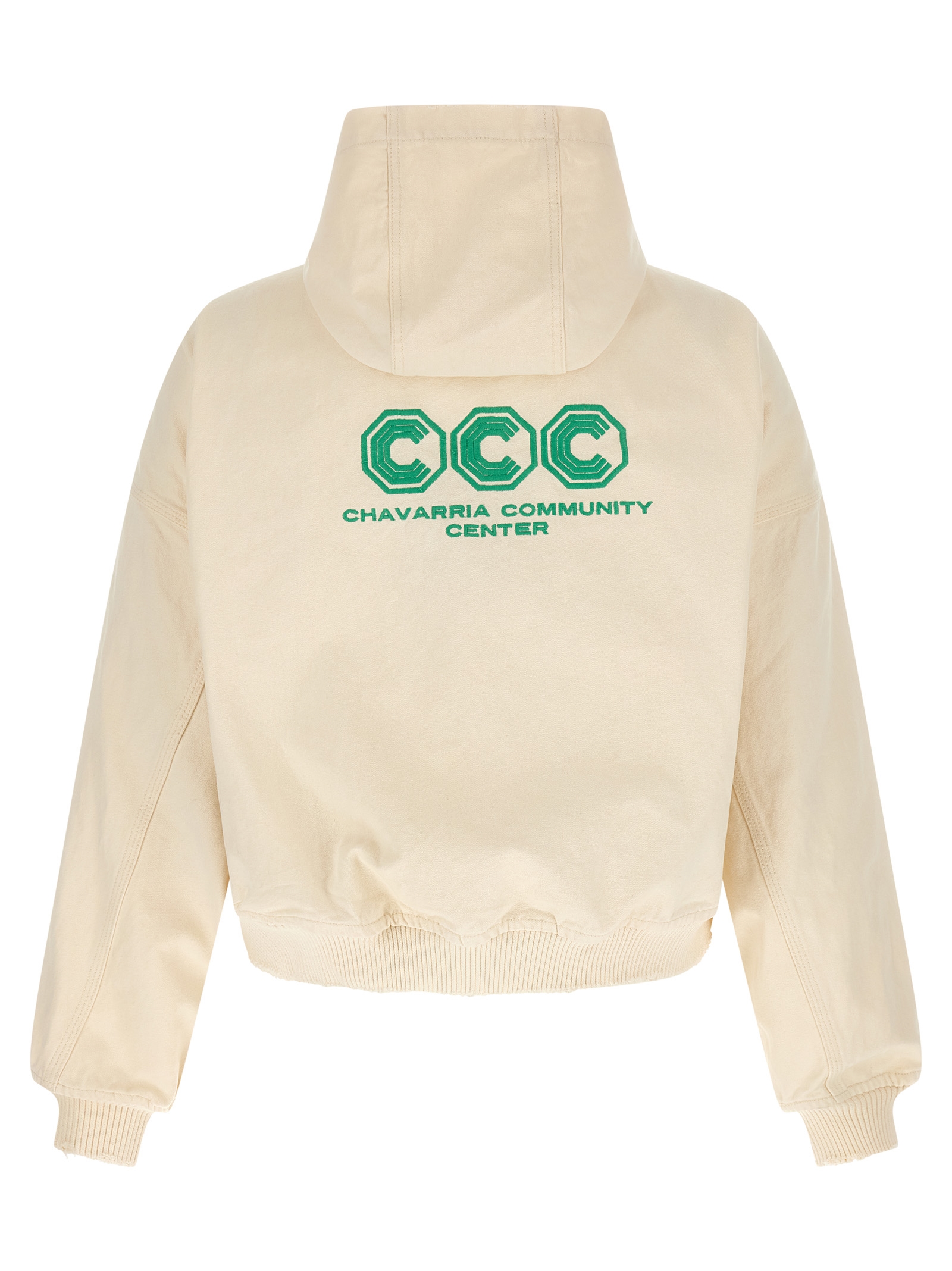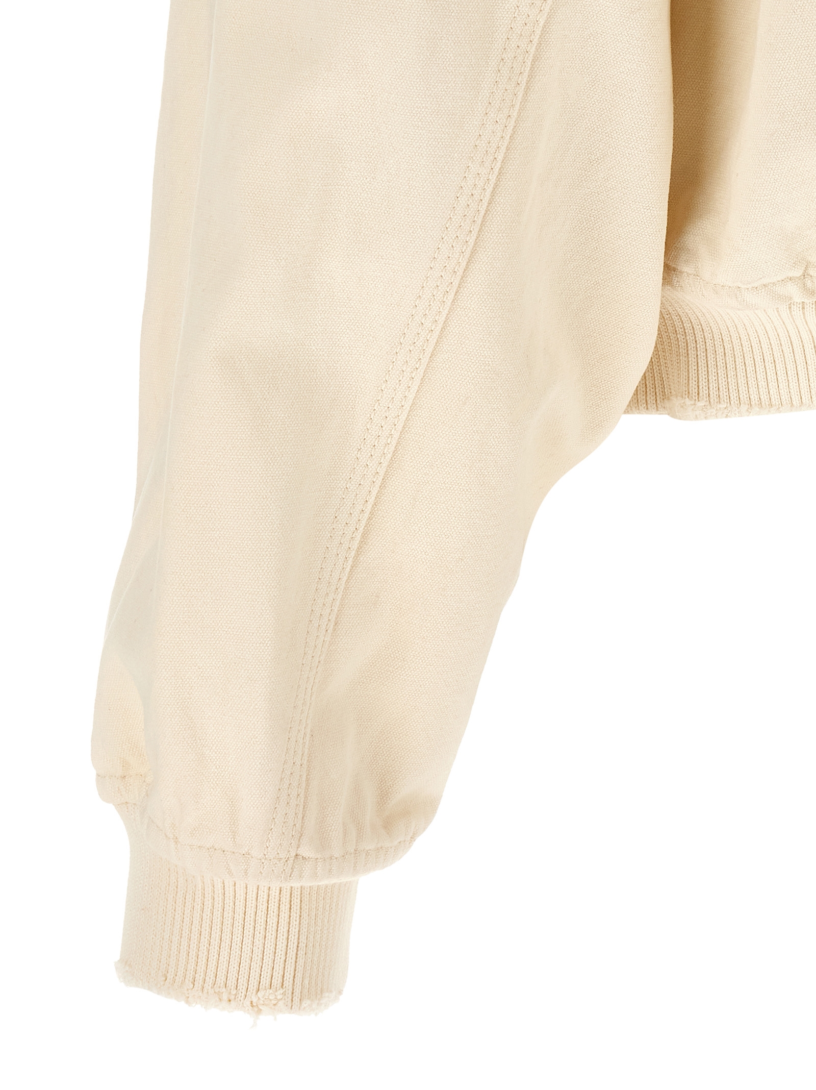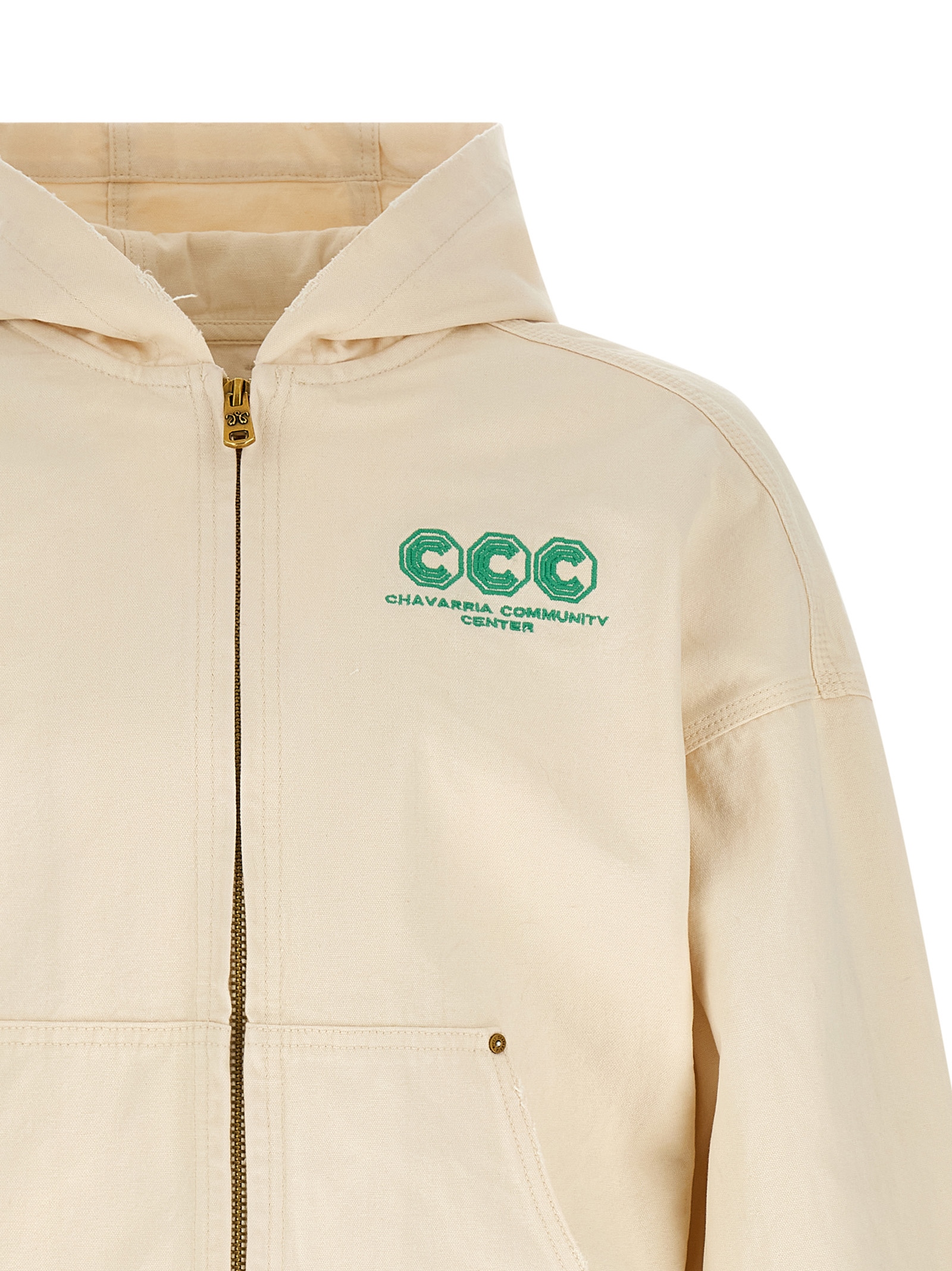 ‘Juggernaut Workwear’ heavy cotton canvas hoodie with used-effect stretch ribbed knit details, double needle stitching, front and back embroidery, front zip closure, pockets, long sleeves with cuffs and dropped shoulders, and headband.