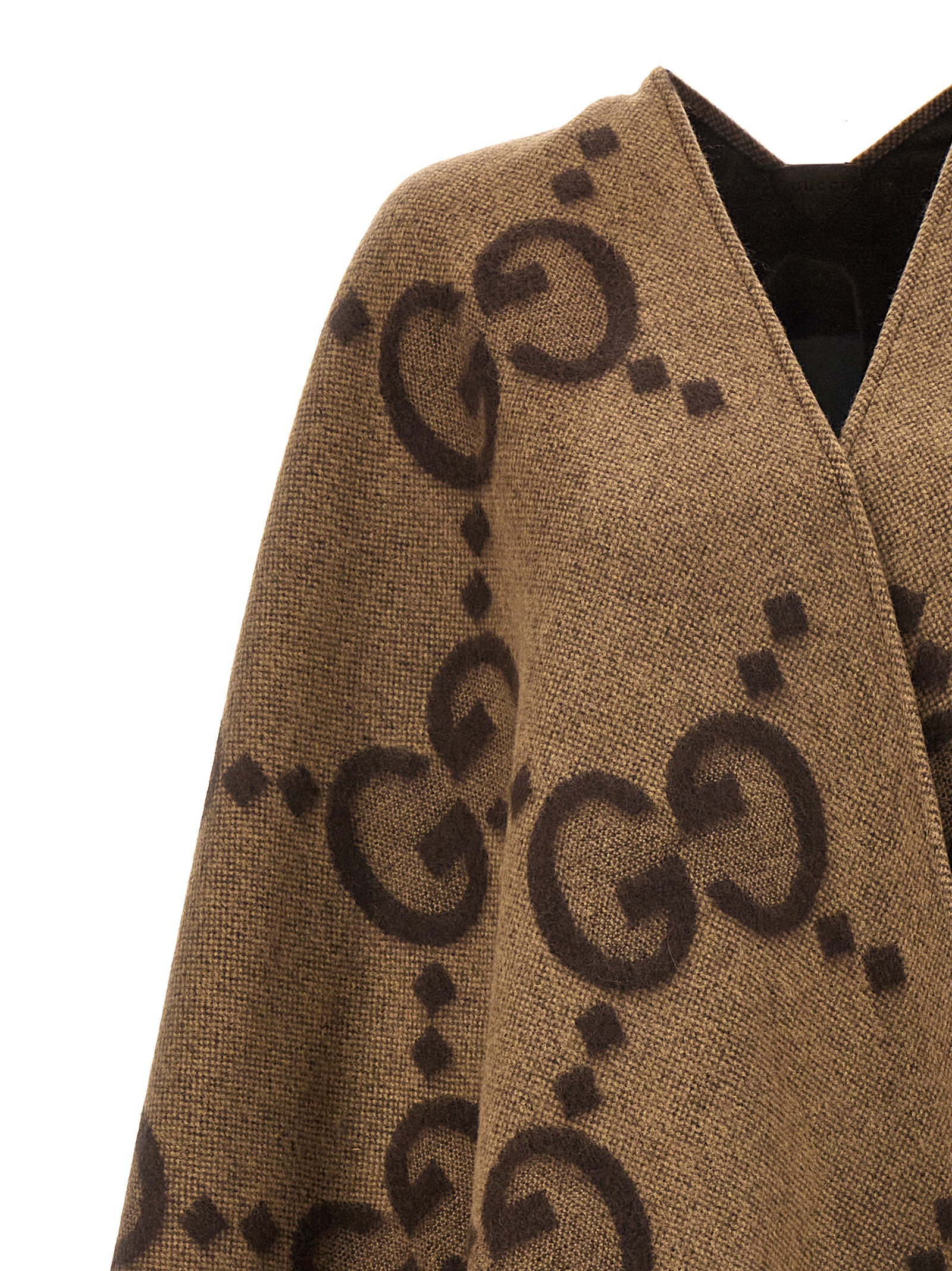 ‘Jumbo GG’ reversible cashmere cape with all-over logo, fringed hem.