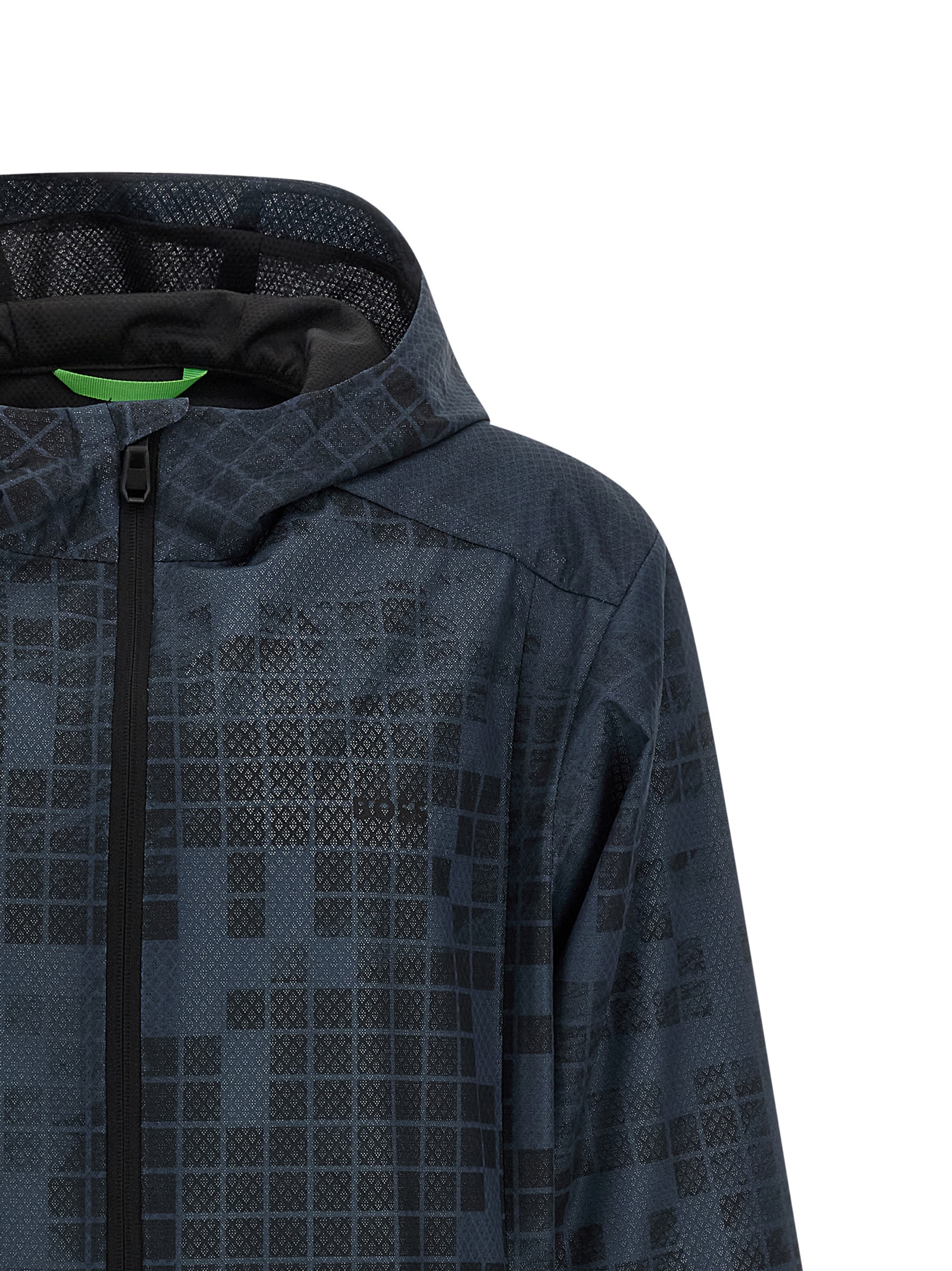 ‘Jump JT’ windbreaker in patterned water-repellent technical fabric, hood, high neck, front zip closure, pockets, long sleeves with cuffs, drawstring on the hem.