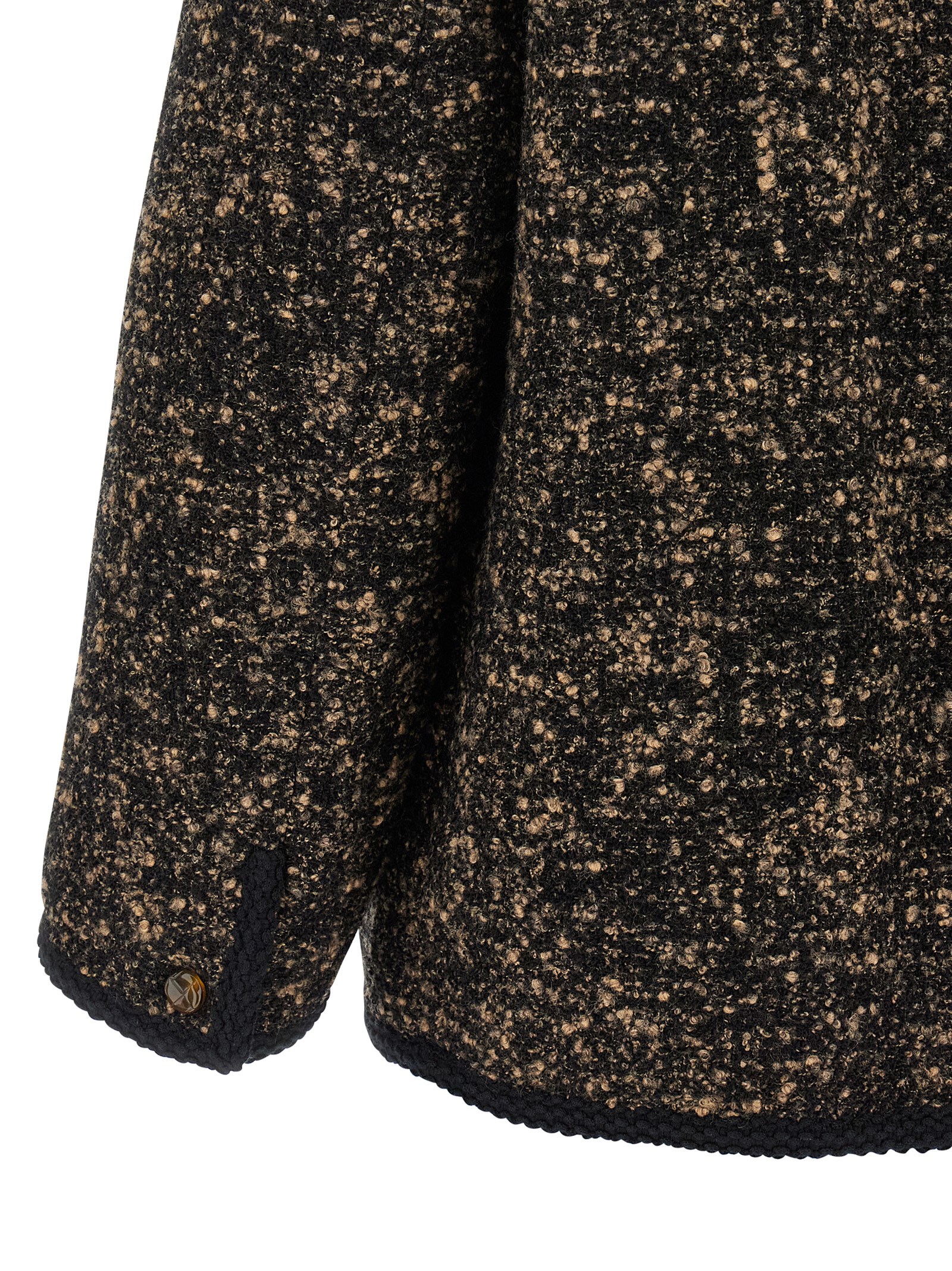 ‘Katara Curly’ bouclè wool blazer with braided wool cord piping, glossy acetate button closure on the front, ‘Smiley’ pockets, mandarin collar, long sleeves with slightly dropped shoulder straps, monogram viscose lining.
