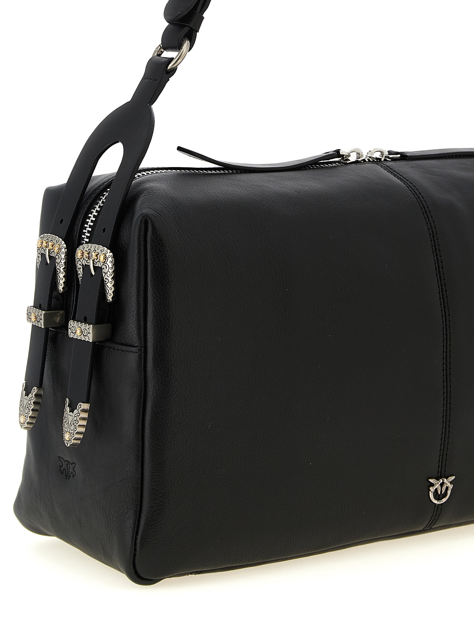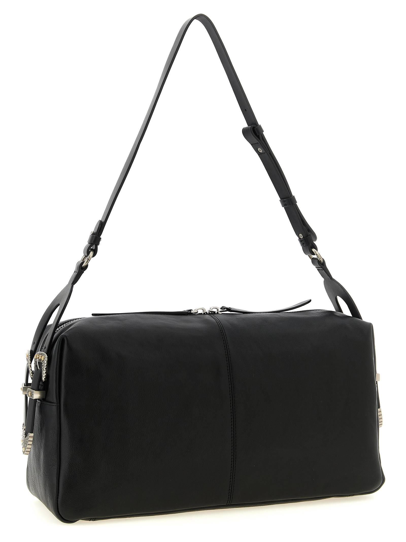 ‘Keeper’ large shoulder bag in new biker leather, slightly elongated rectangular silhouette, metal ‘Love Birds Diamond Cut’ logo on the front, adjustable handle with western and country style metal details, top zip closure, cotton drill lining.
