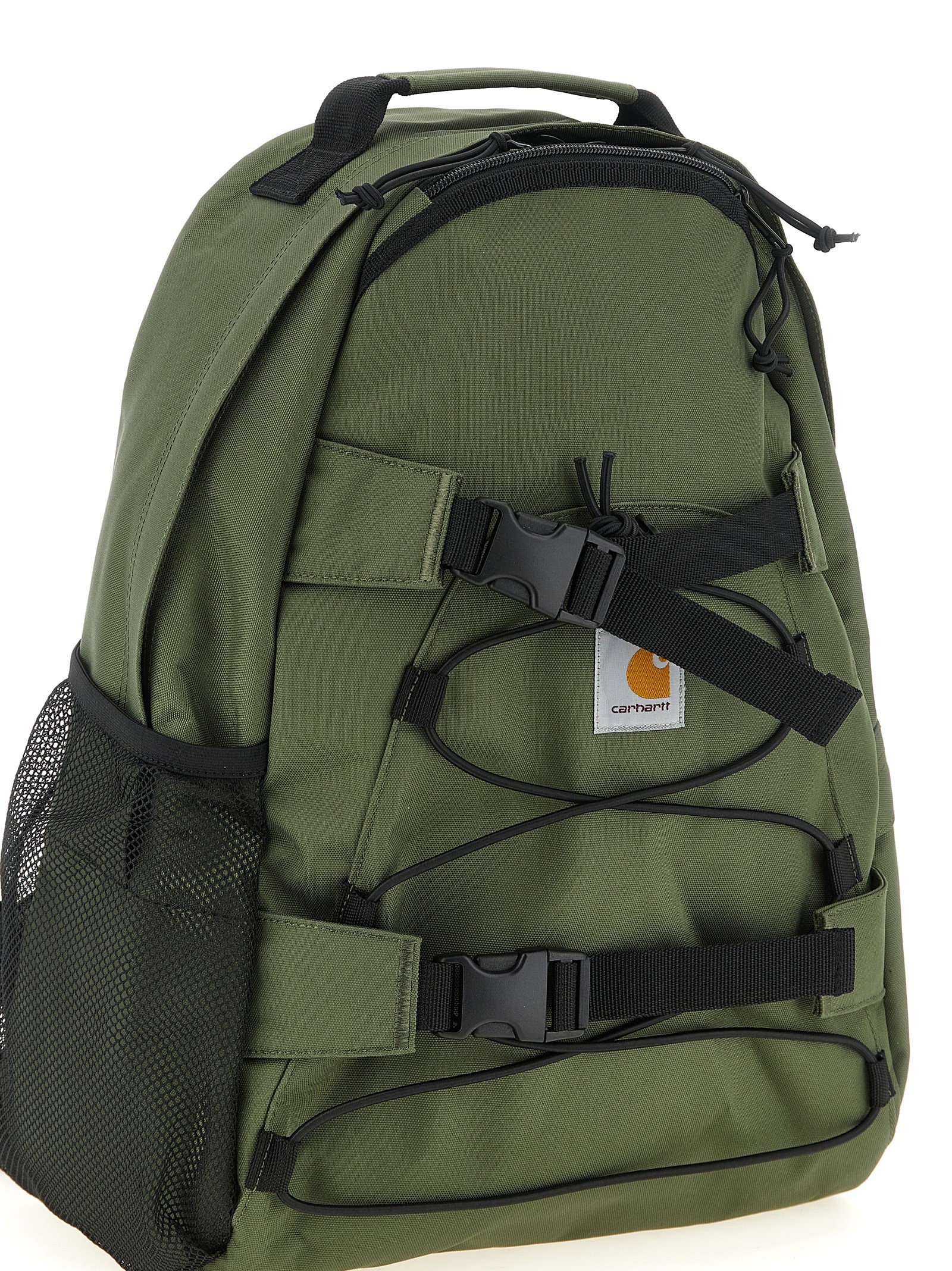 ‘Kickflip’ waterproof polyester blend canvas backpack without lining, front logo patch, zip closure, adjustable shoulder straps, front skateboard strap detail.