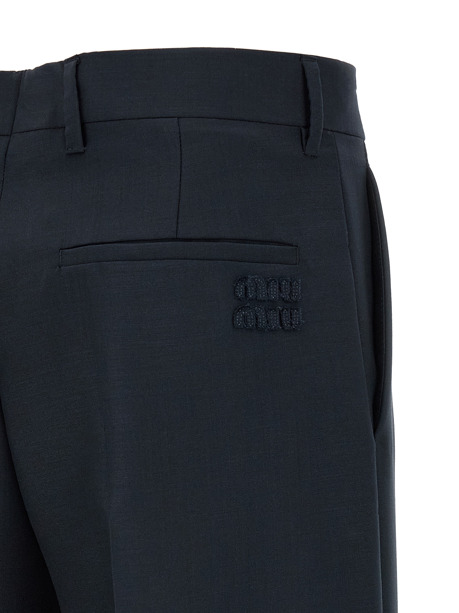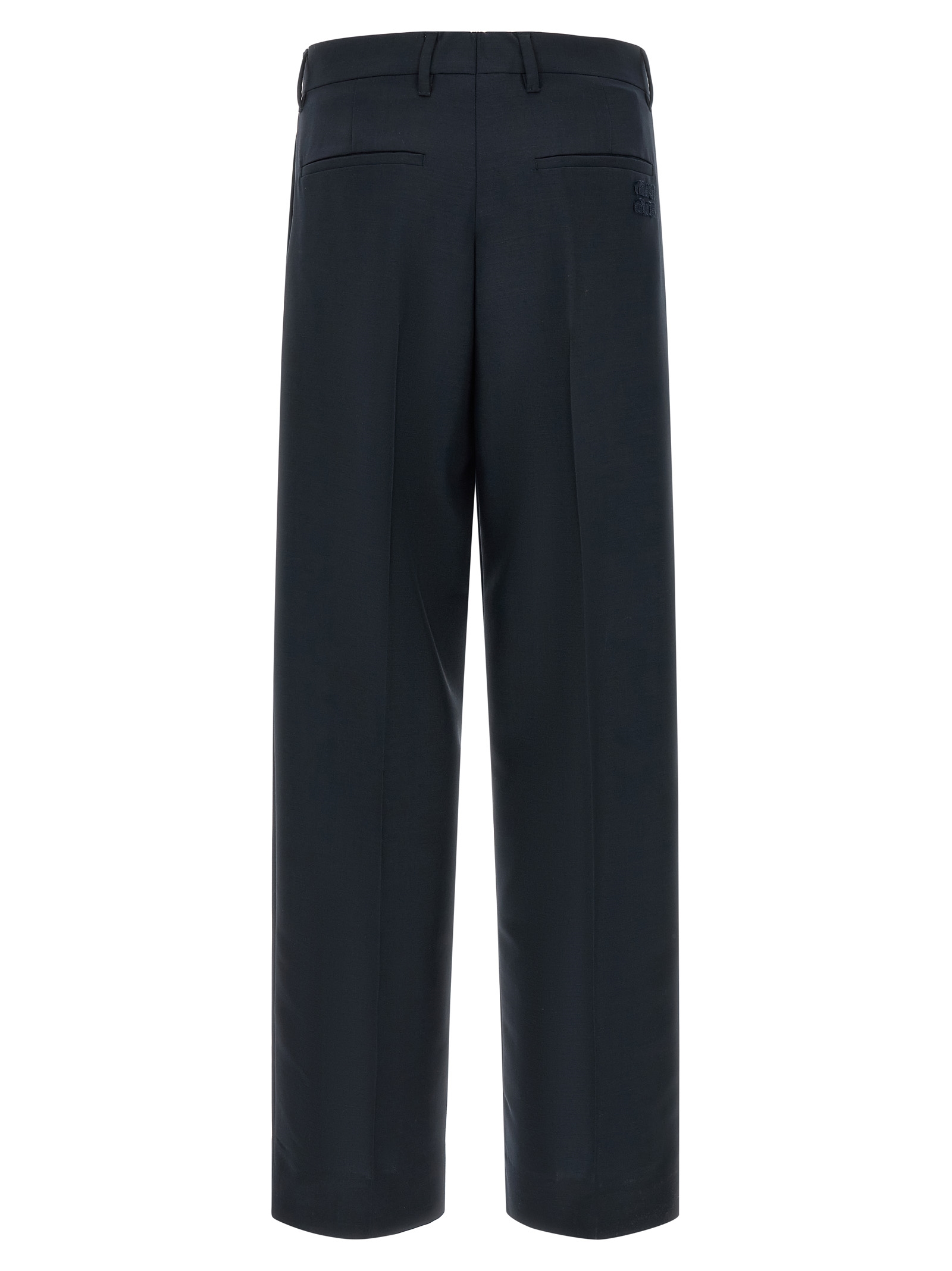 Workwear-inspired tailored kid mohair pants with slightly loose, straight leg, stretched pleat, slightly low crotch, front zip and hook closure, front pockets, tone-on-tone logo lettering patch and back welt pockets.