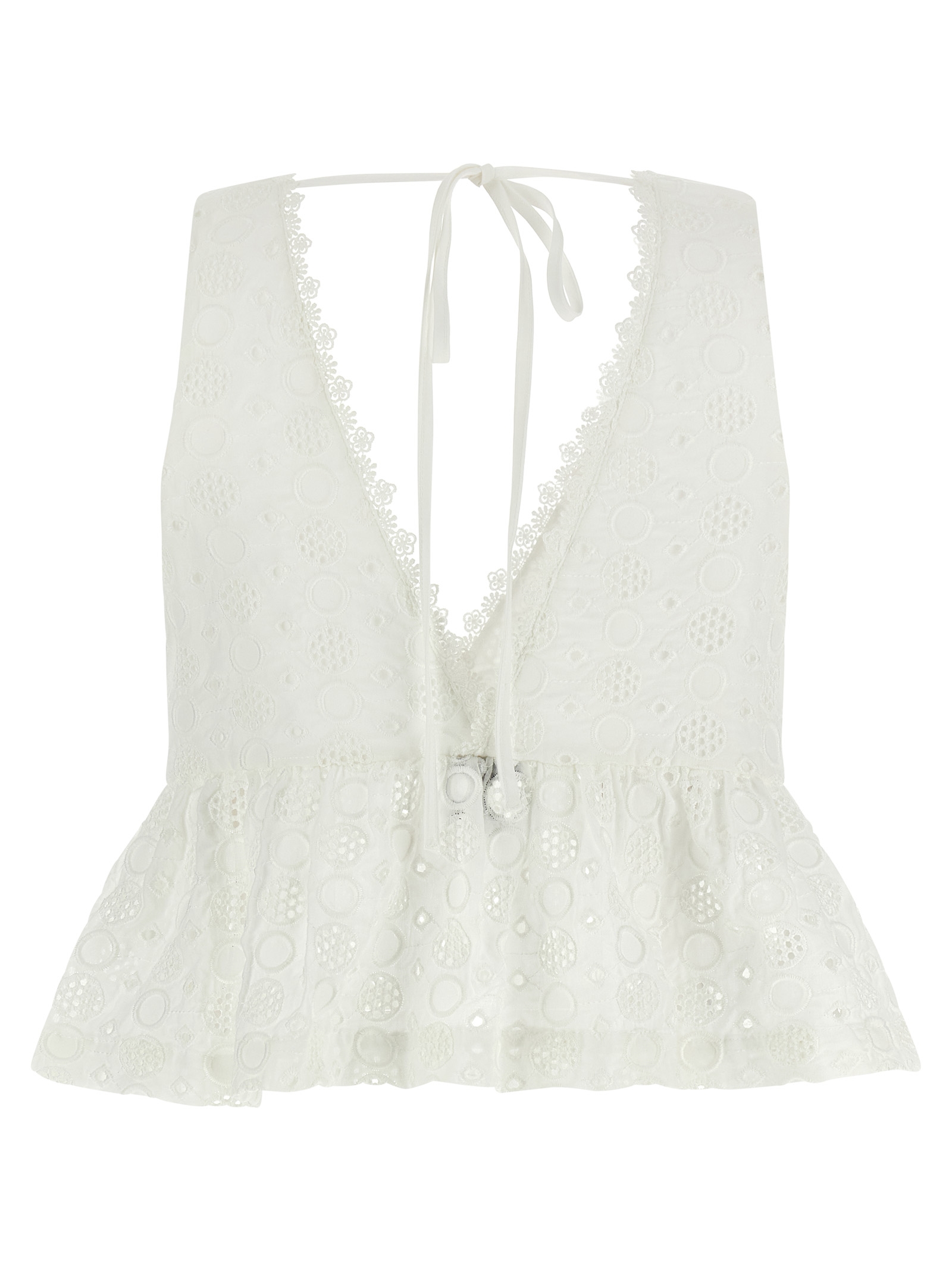 ‘Kiersten’ cropped top in sangallo with V-neck on the front and back, lacing to tie at the back, side zip closure, flounce on the hem.