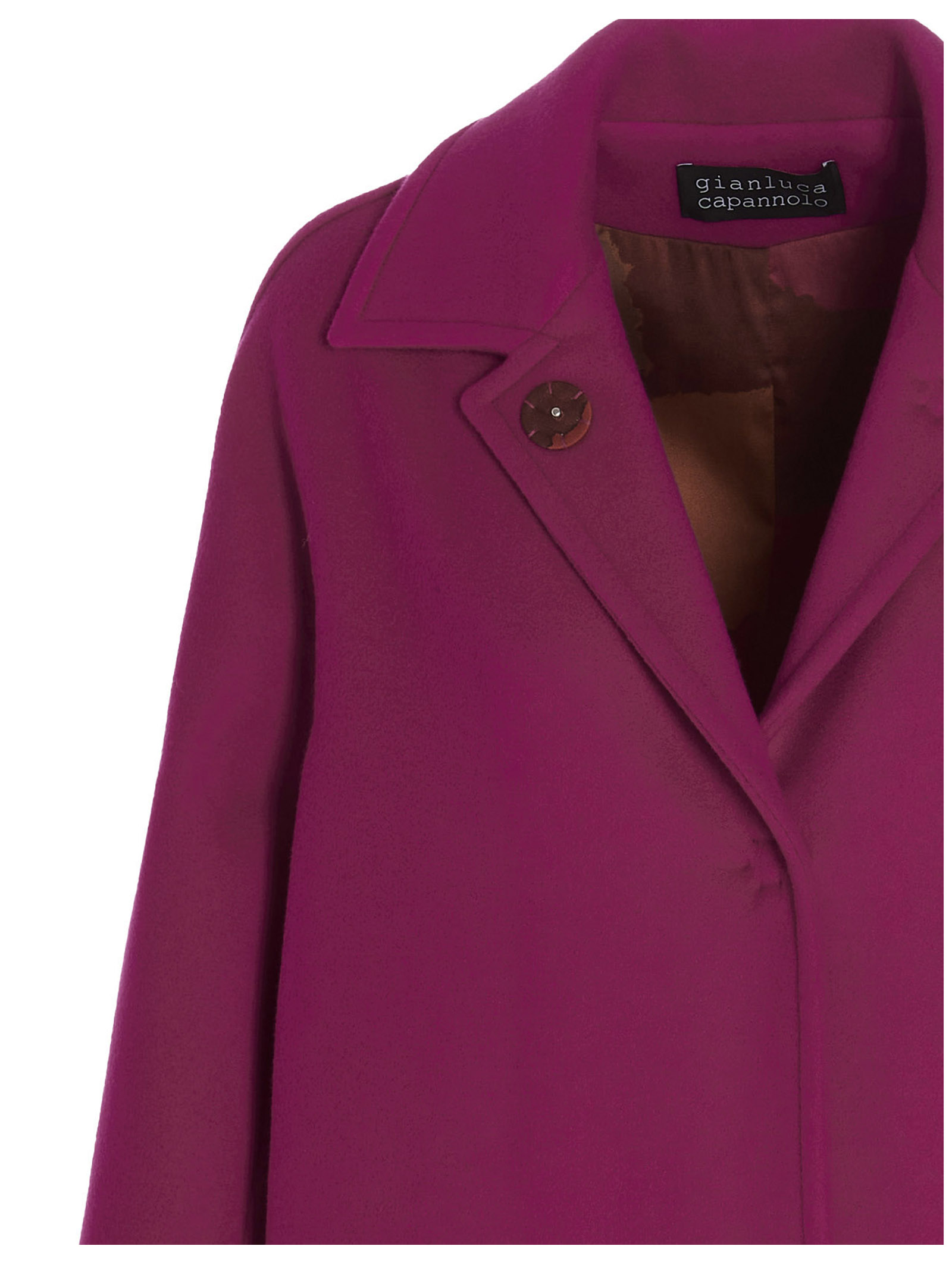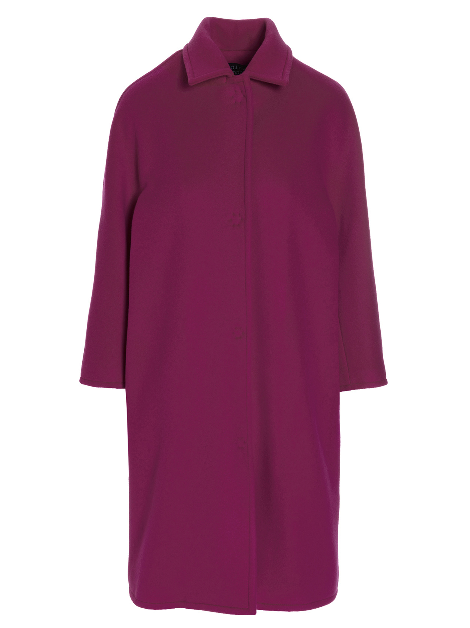 ‘Kim’ single-breasted virgin wool coat with three-quarter sleeves, side pockets and snap button closure.