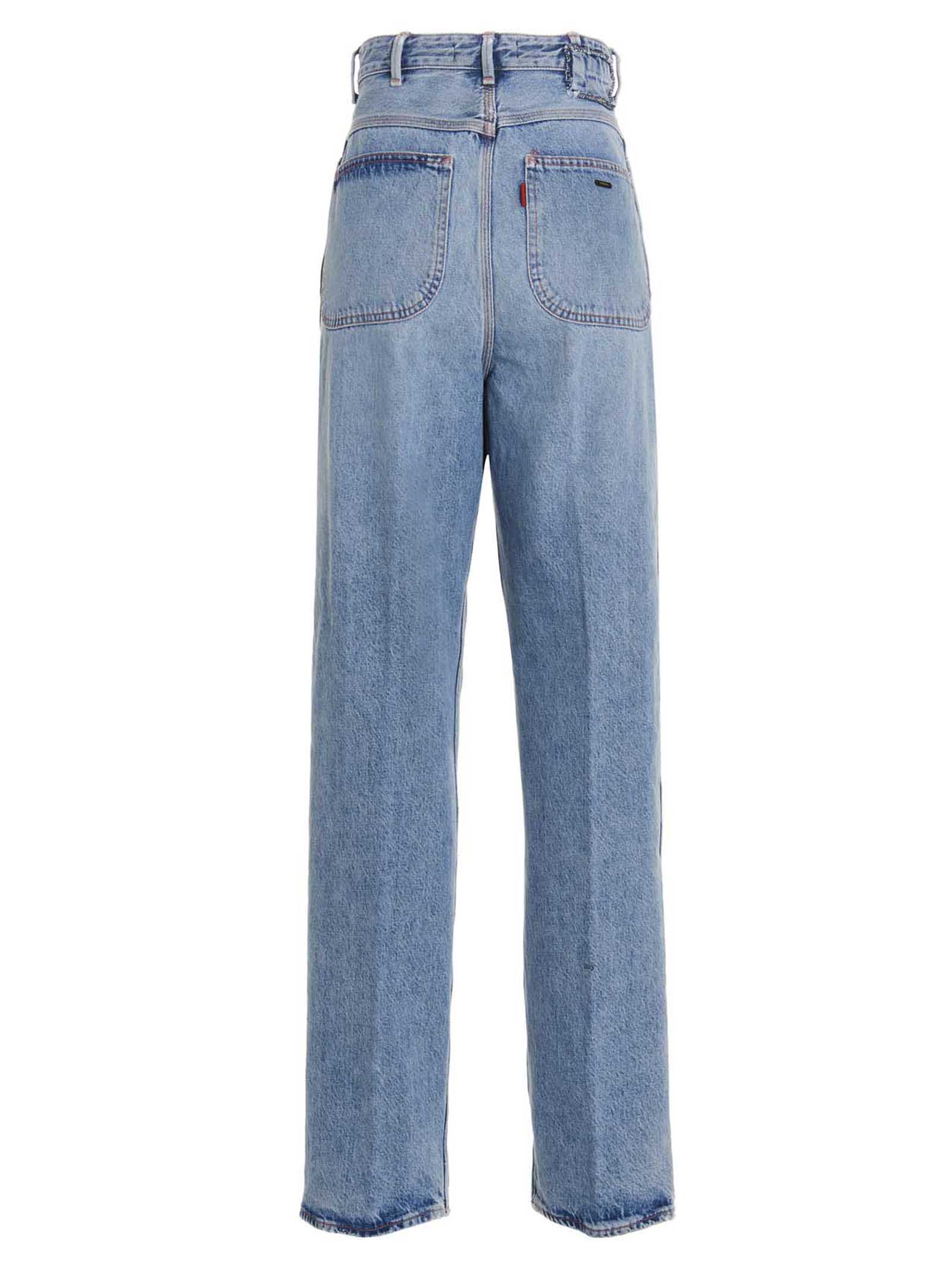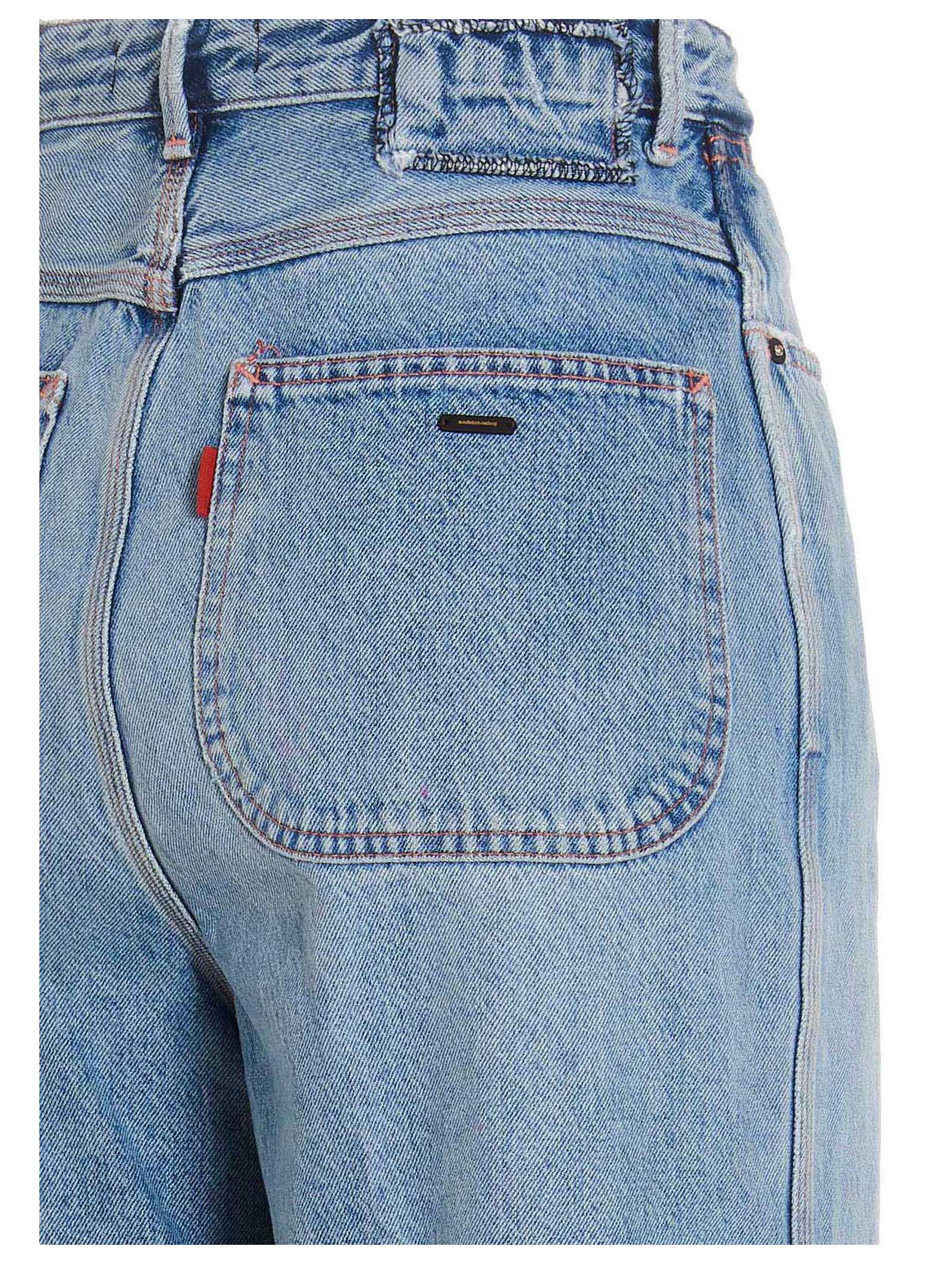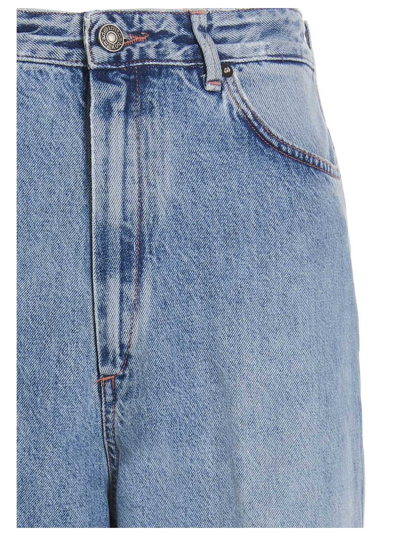 ‘Kim’ five-pocket wide leg jeans with rounded pockets, zip and button, contrast stitching.