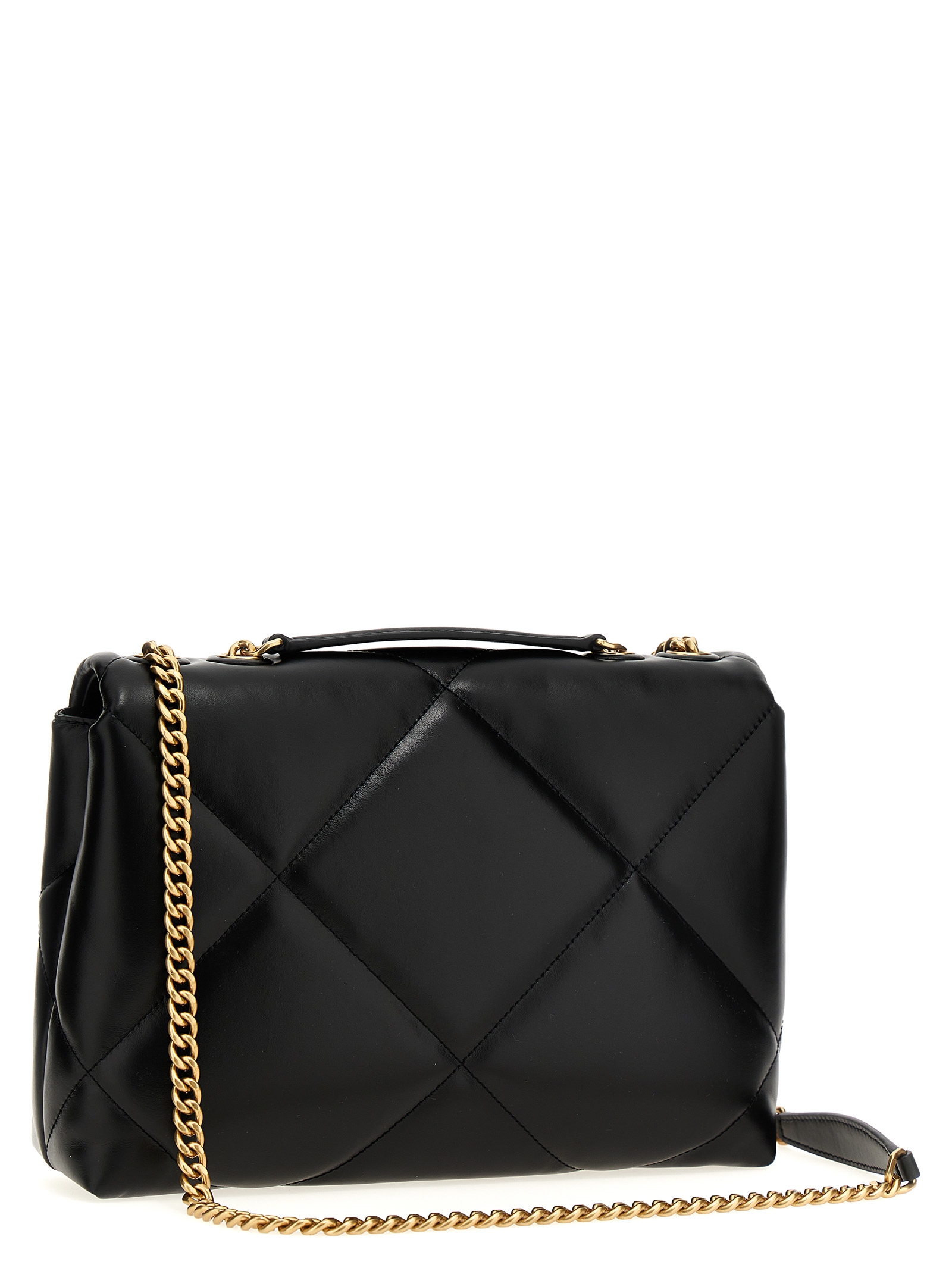 Kira Diamond Quilt Convertible’ quilted leather shoulder bag, magnetic flap closure, front metal logo, chain and leather handle.