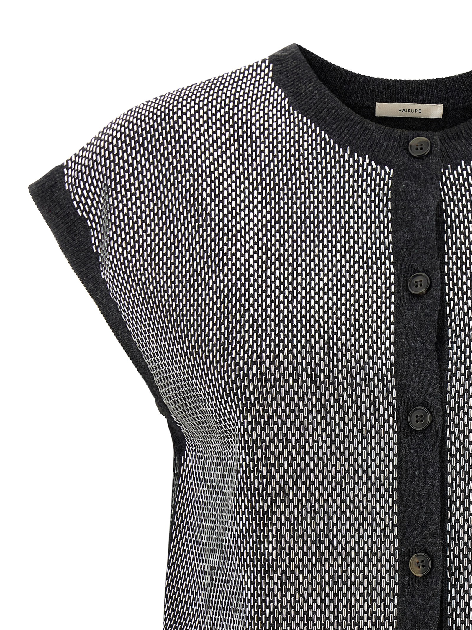 Kirby’ virgin wool vest with all-over baguette studs, crew neck, front button closure.