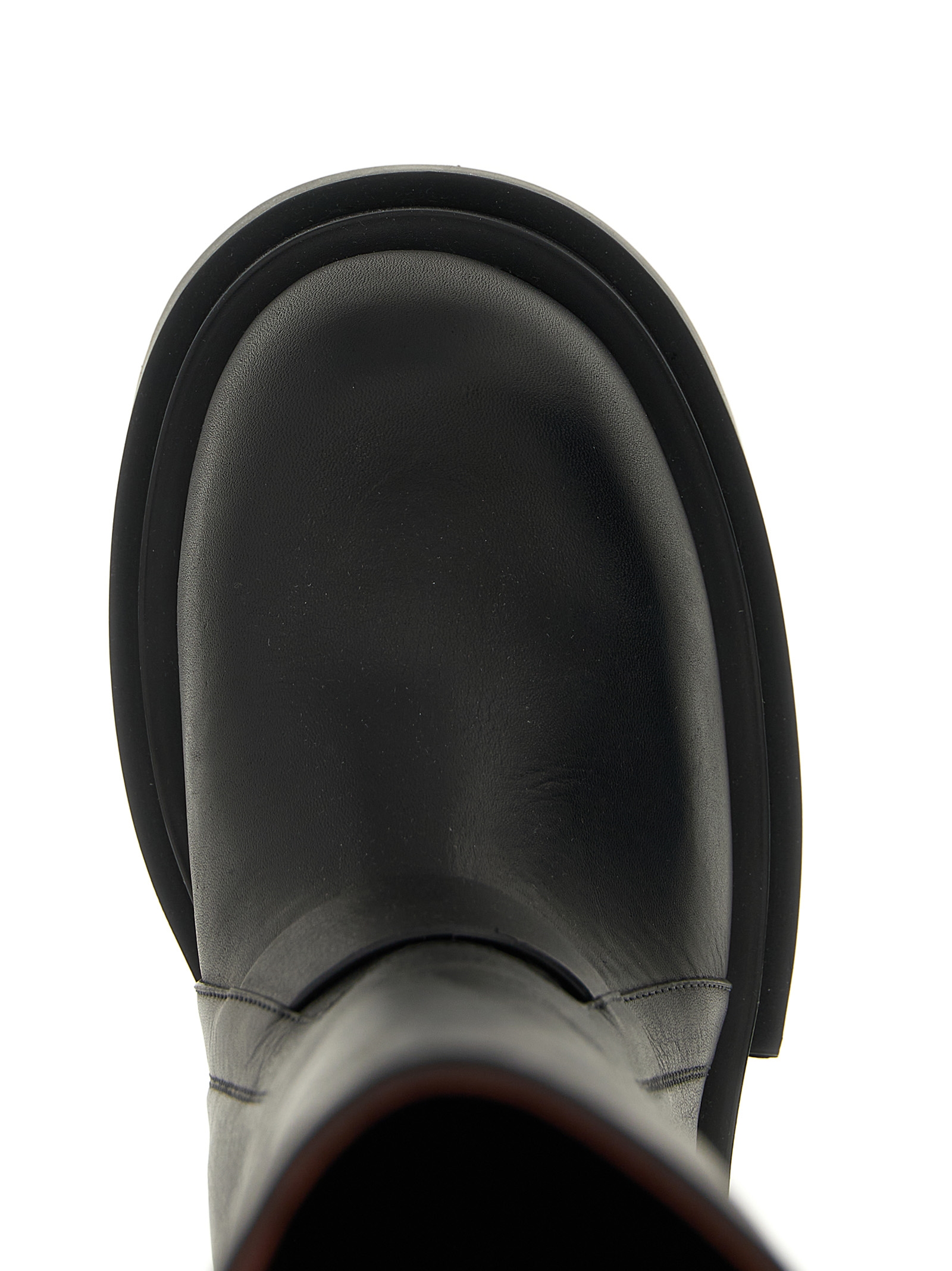 ‘Knee Pull On Bogun’ vegetable tanned leather boots of medium weight, round toe, tubular leg, adjustable strap, bogun mega creeper rubber sole with square toothed heel.
