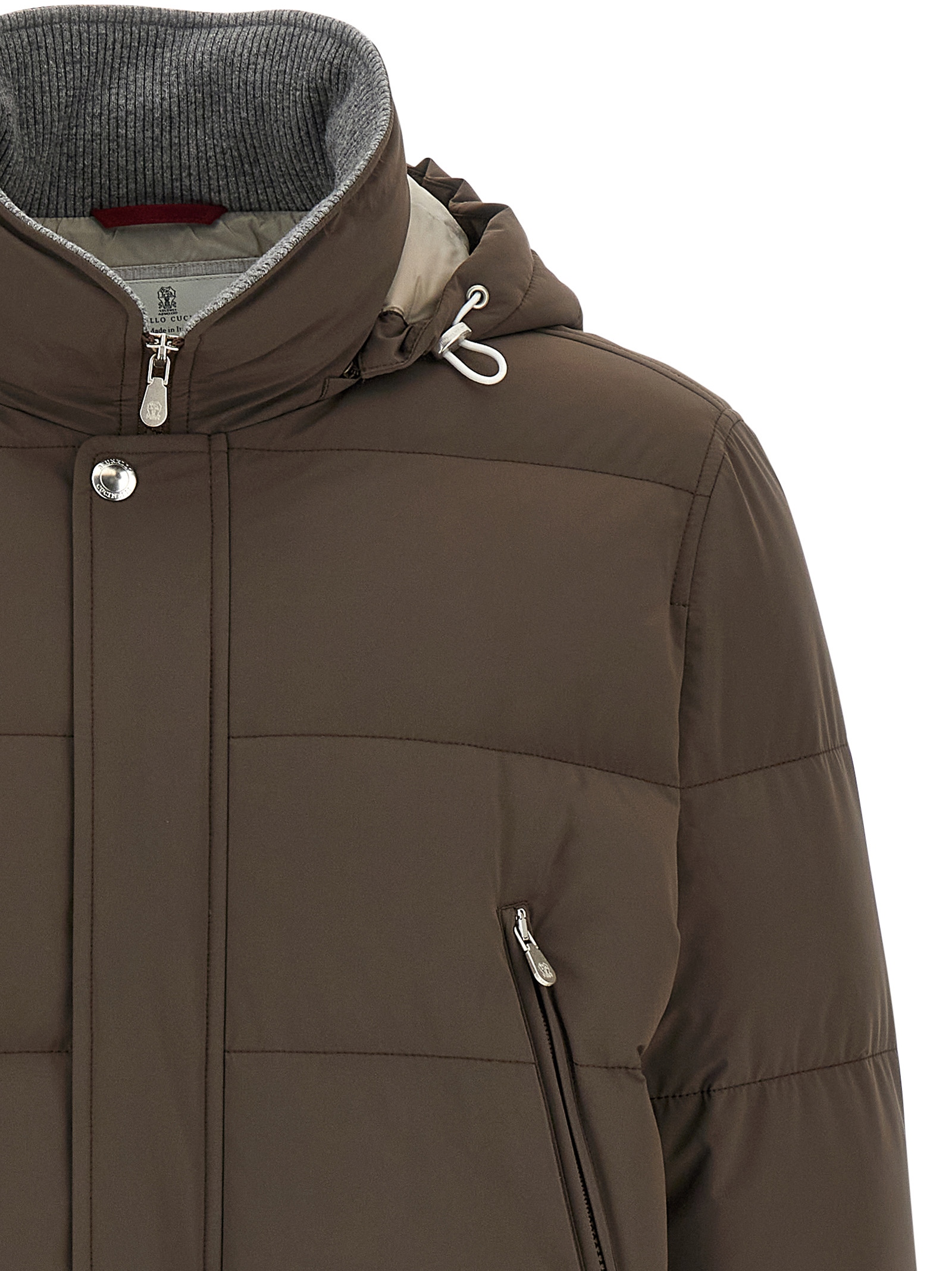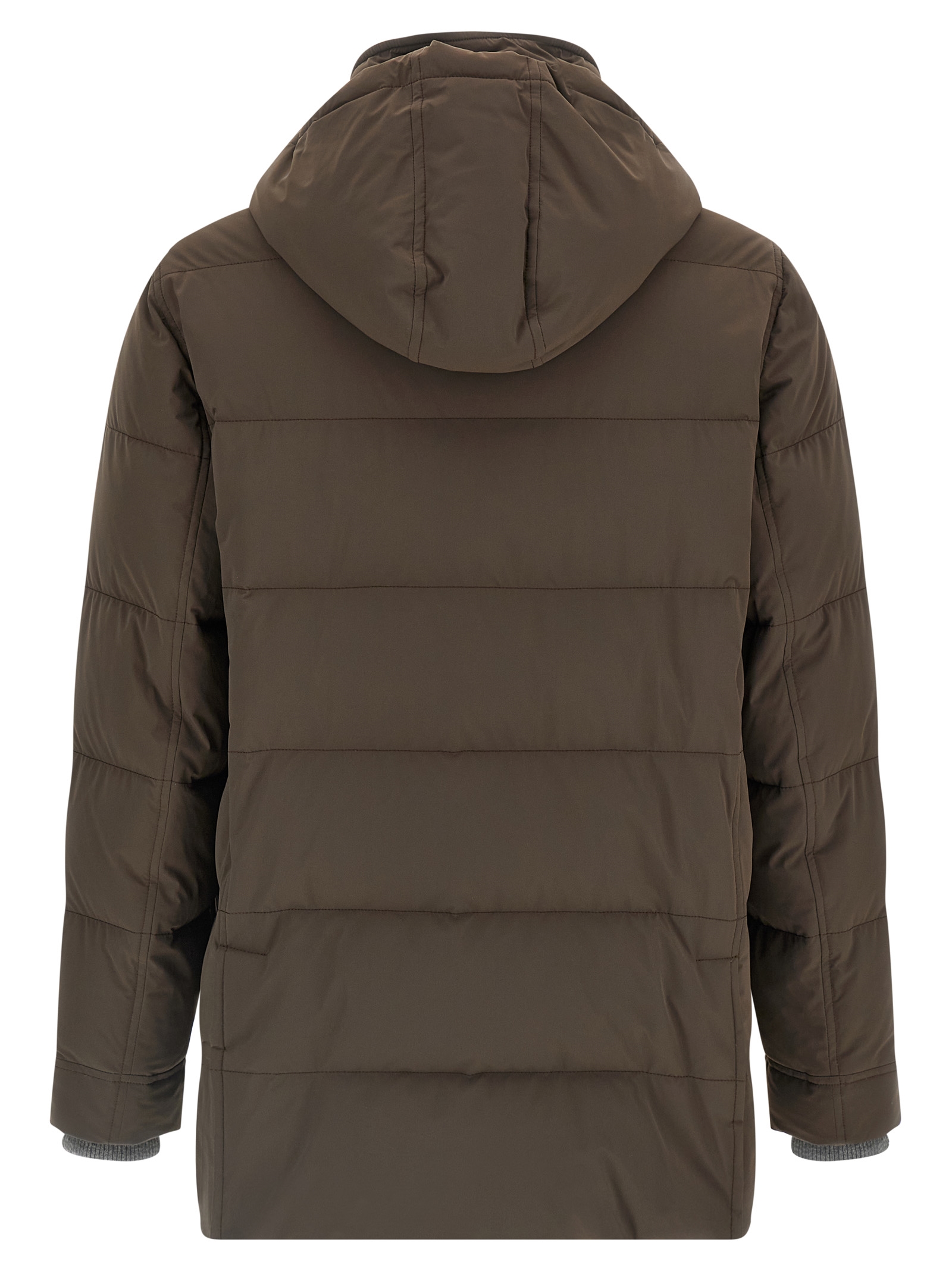 Quilted tech fabric jacket with water-repellent goose down padding with ribbed cotton knit inserts, adjustable and removable hood, standing collar, front zip and snap button closure, pockets, long sleeves with elastic cuffs, adjustable slits with back snap buttons.