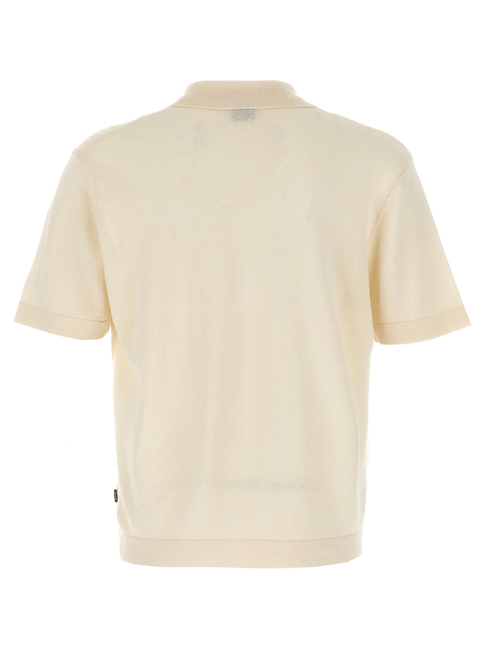 Linen blend knit shirt with classic collar, button closure, front perforation, short sleeves.