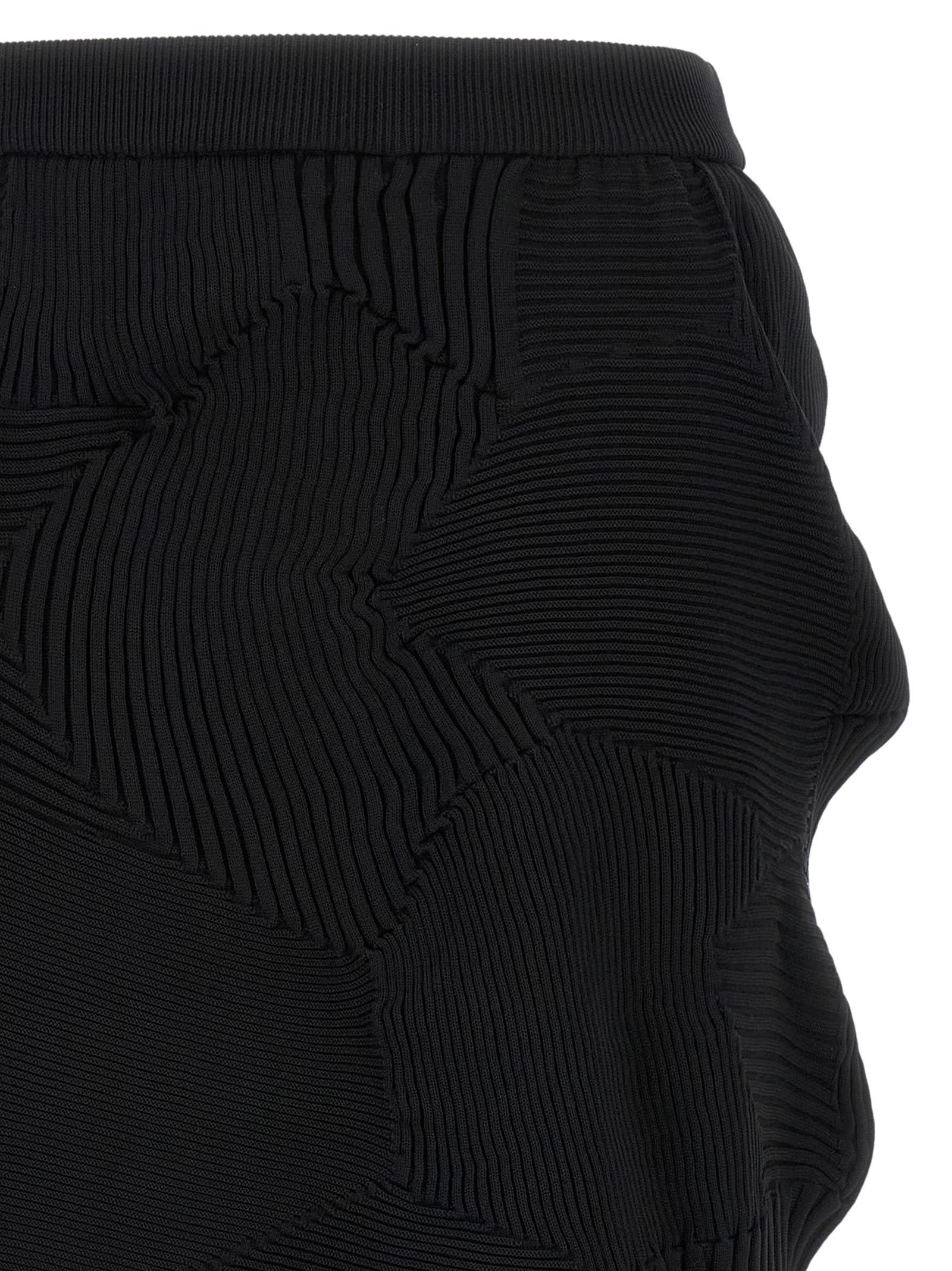 Kone Kone’ midi skirt in patchwork, seamless pleated fabric with elastic weave structure made with multiple knitted patterns, elastic waistband, side split, and asymmetrical hem.