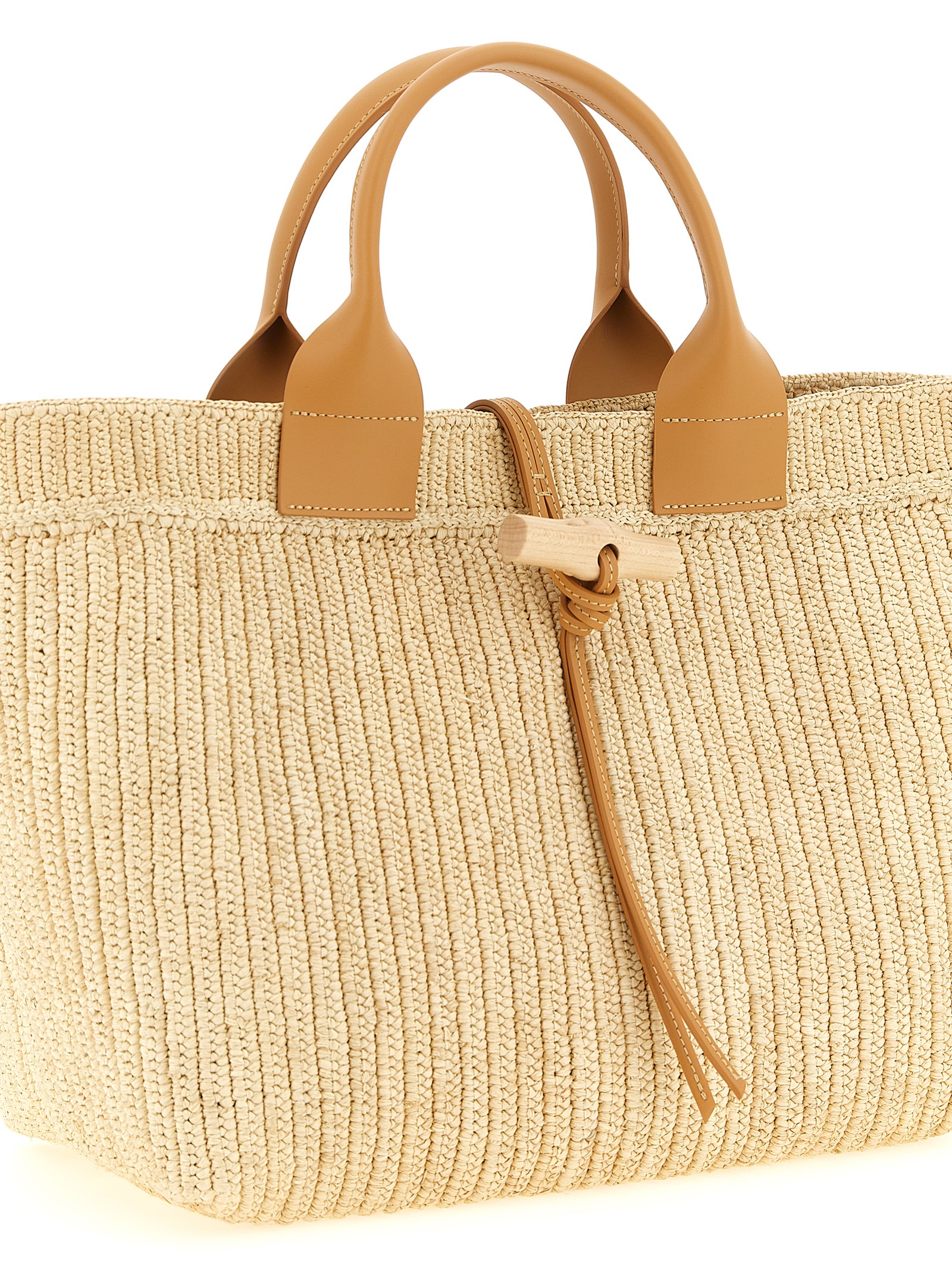 ‘L Le Roseau’ shopping bag made from a single hand-woven raffia panel with leather details, double fixed handle, and iconic bamboo-inspired closure in raw maple wood.