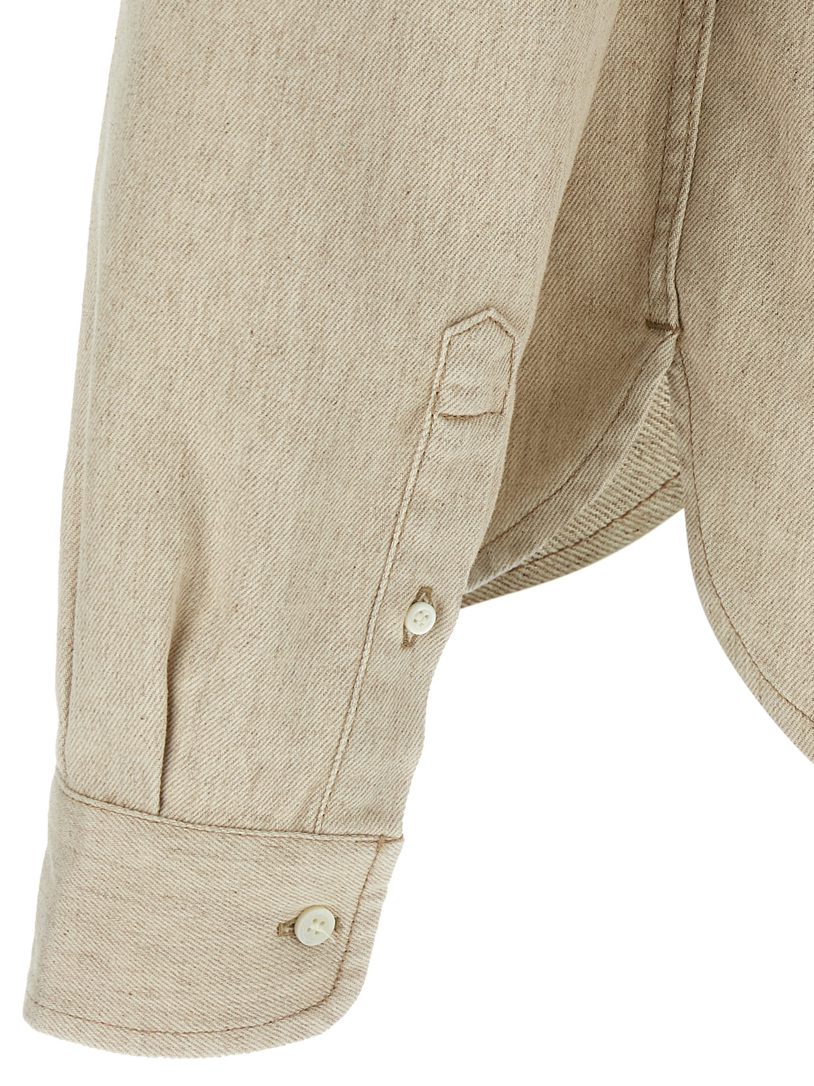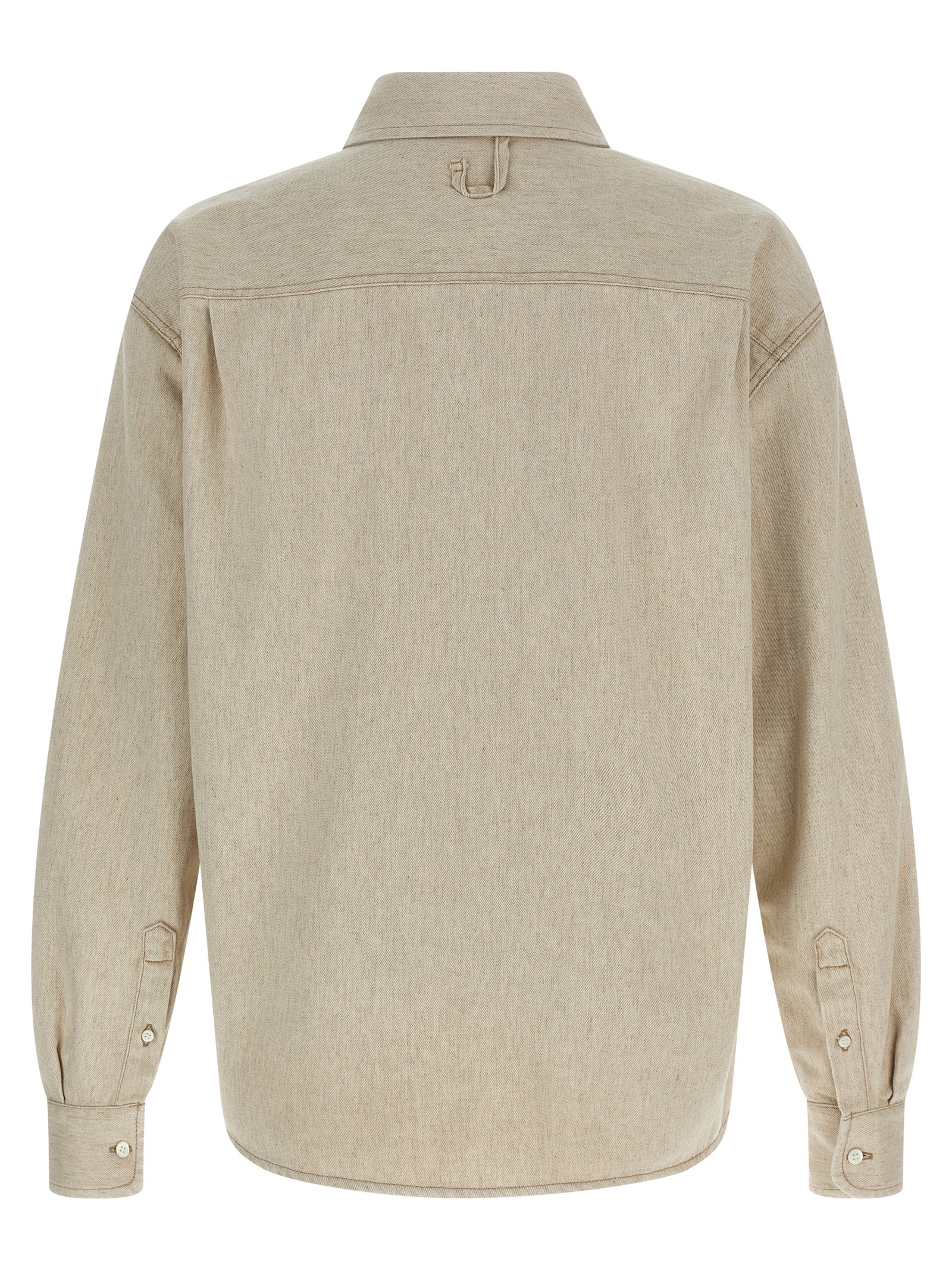 ‘La Chemise De-Nîmes Simon’ cotton and hemp denim shirt with logo embroidery and front button closure, long sleeves with cuffs and dropped shoulders, asymmetric hem.