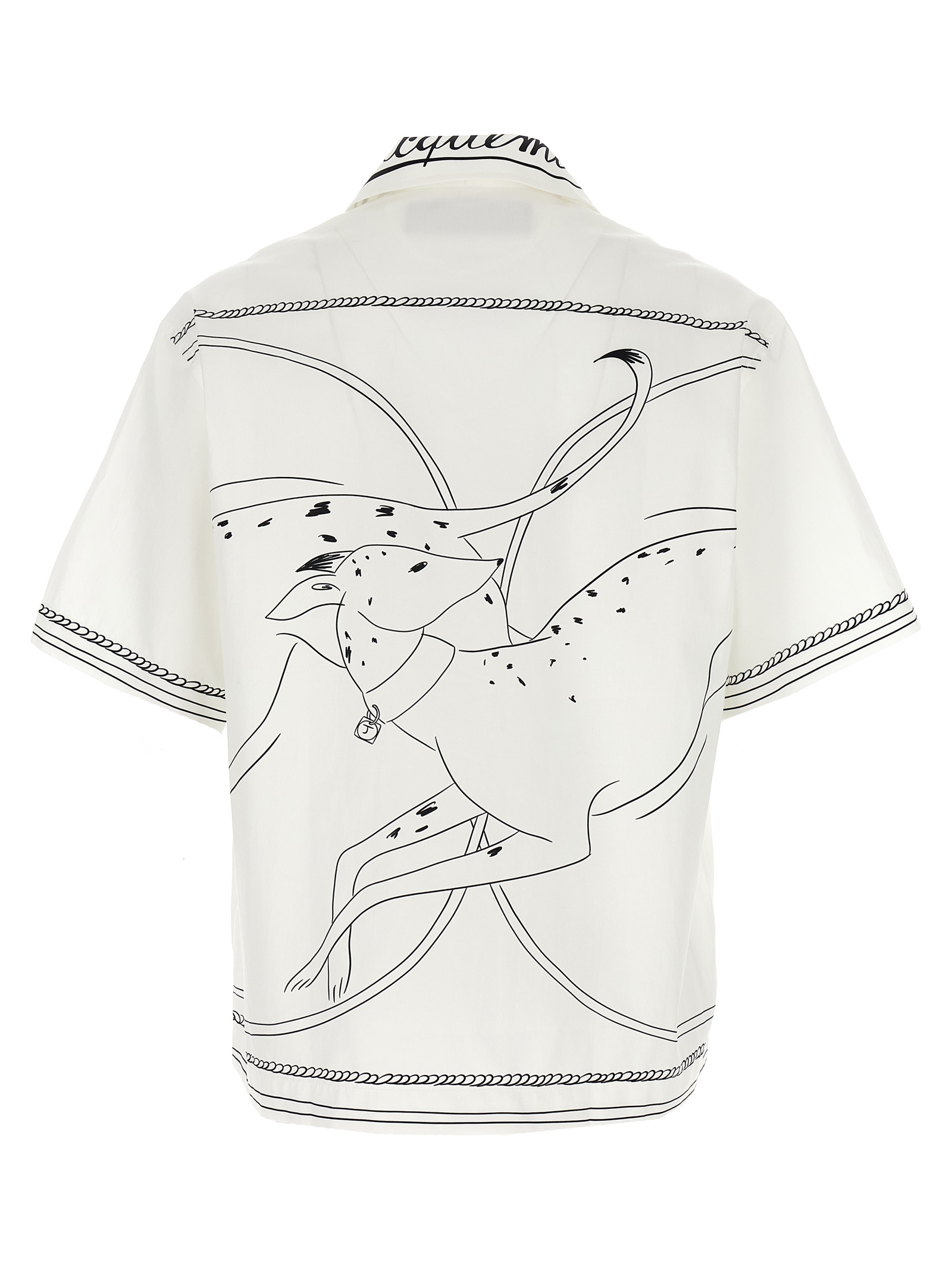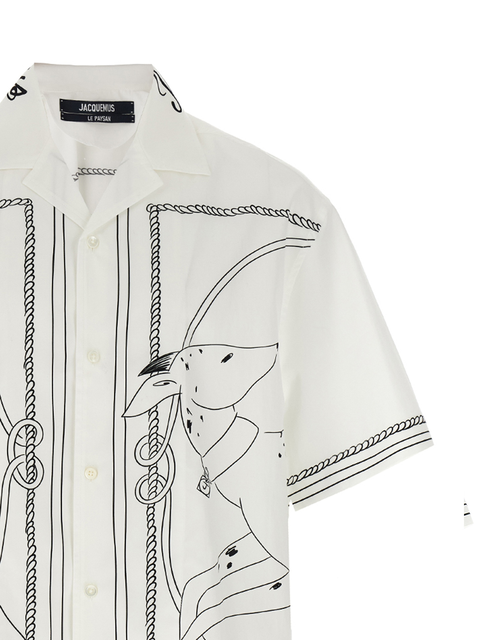 La Chemise Jean shirt in cotton poplin with all-over print, V-neck with lapels, front button closure, and short sleeves.