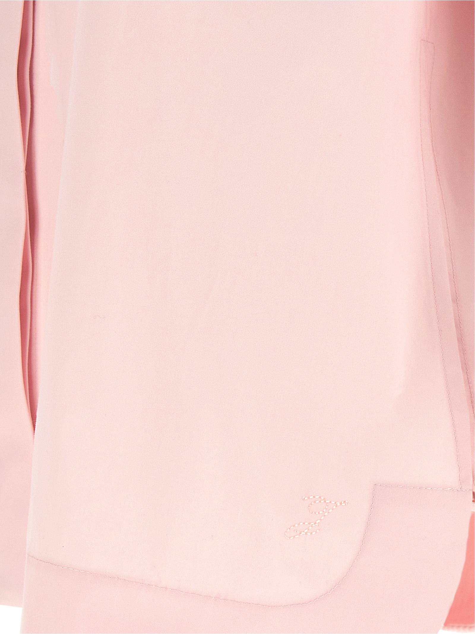 Compact cotton poplin ‘La Chemise Pittore’ shirt with boat neckline, tone-on-tone logo embroidery and concealed front button closure, long wide and curved cuffed sleeves, side button slits, draped panel and back balloon hem, and asymmetrical hem.