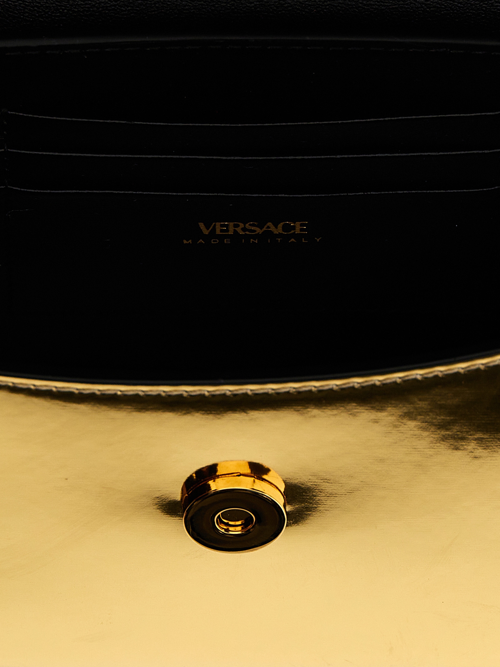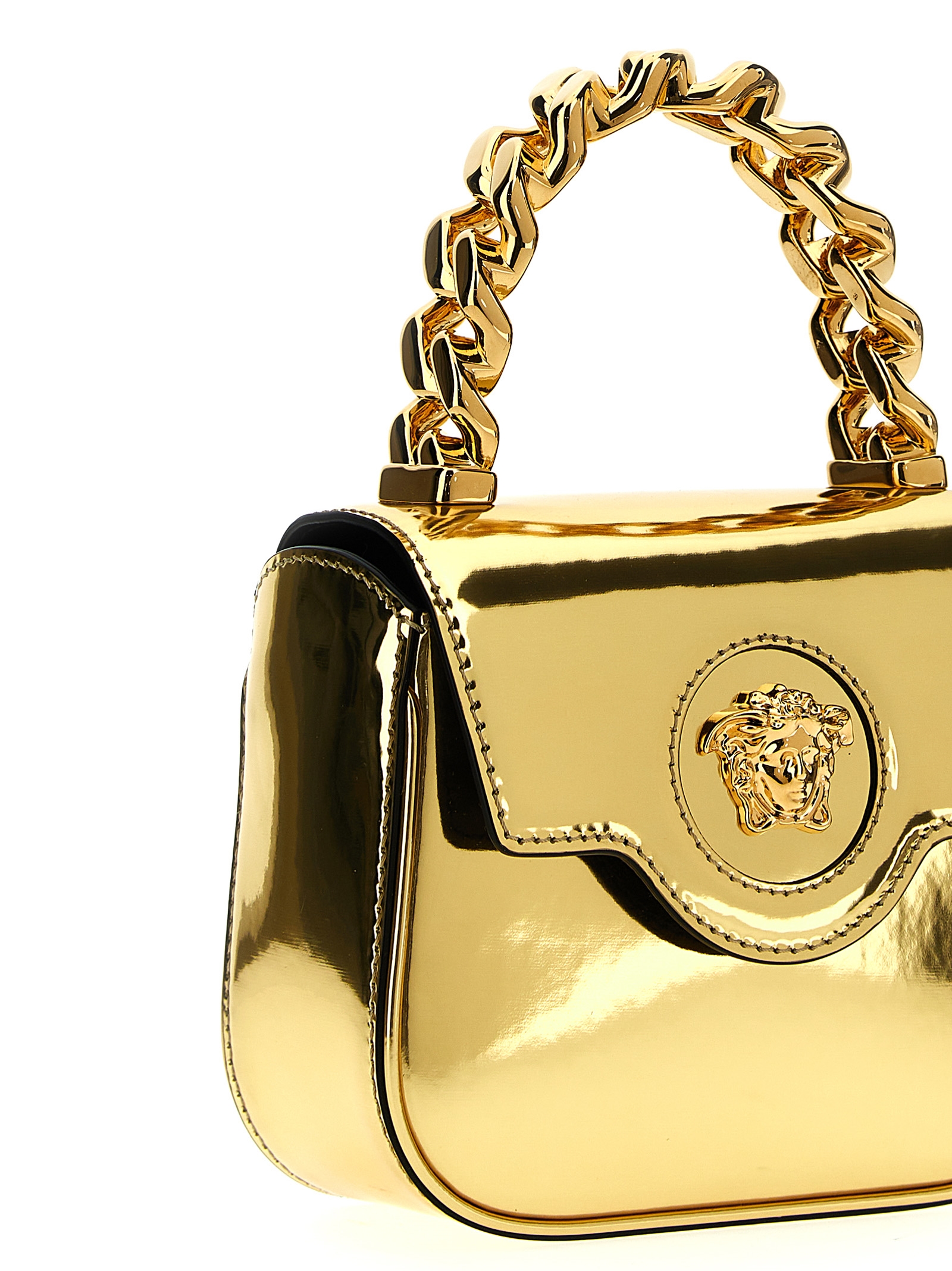 ‘La Medusa’ laminated leather mini handbag with magnetic closure, front metal application, rigid chain handle, adjustable and removable shoulder strap.