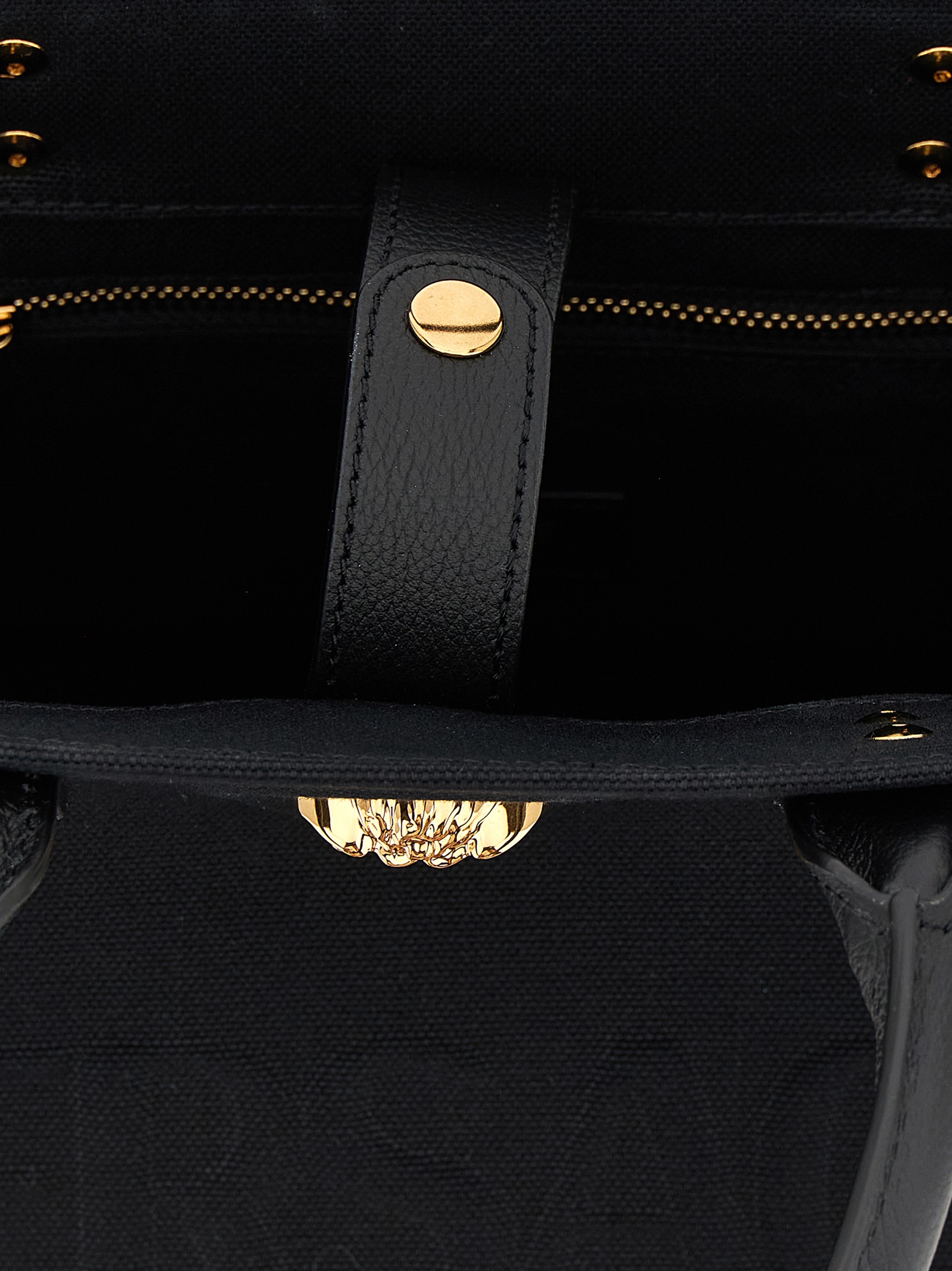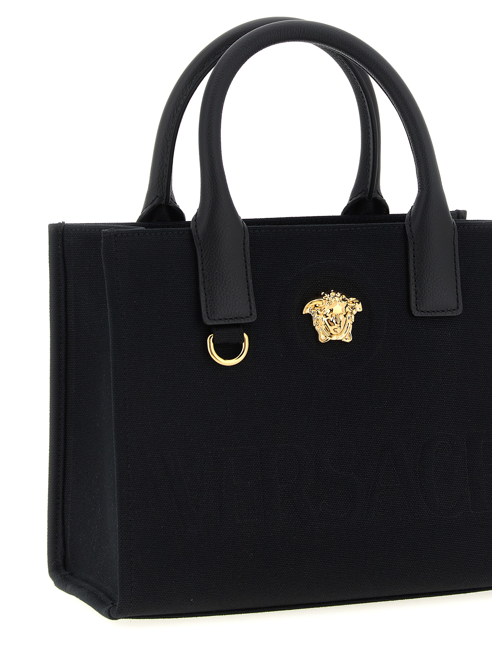 Mini shopping bag in cotton canvas with metal ‘La Medusa’ detail and front 3D logo, double fixed leather handle, strap closure with snap button, metal details, adjustable and removable leather shoulder strap.