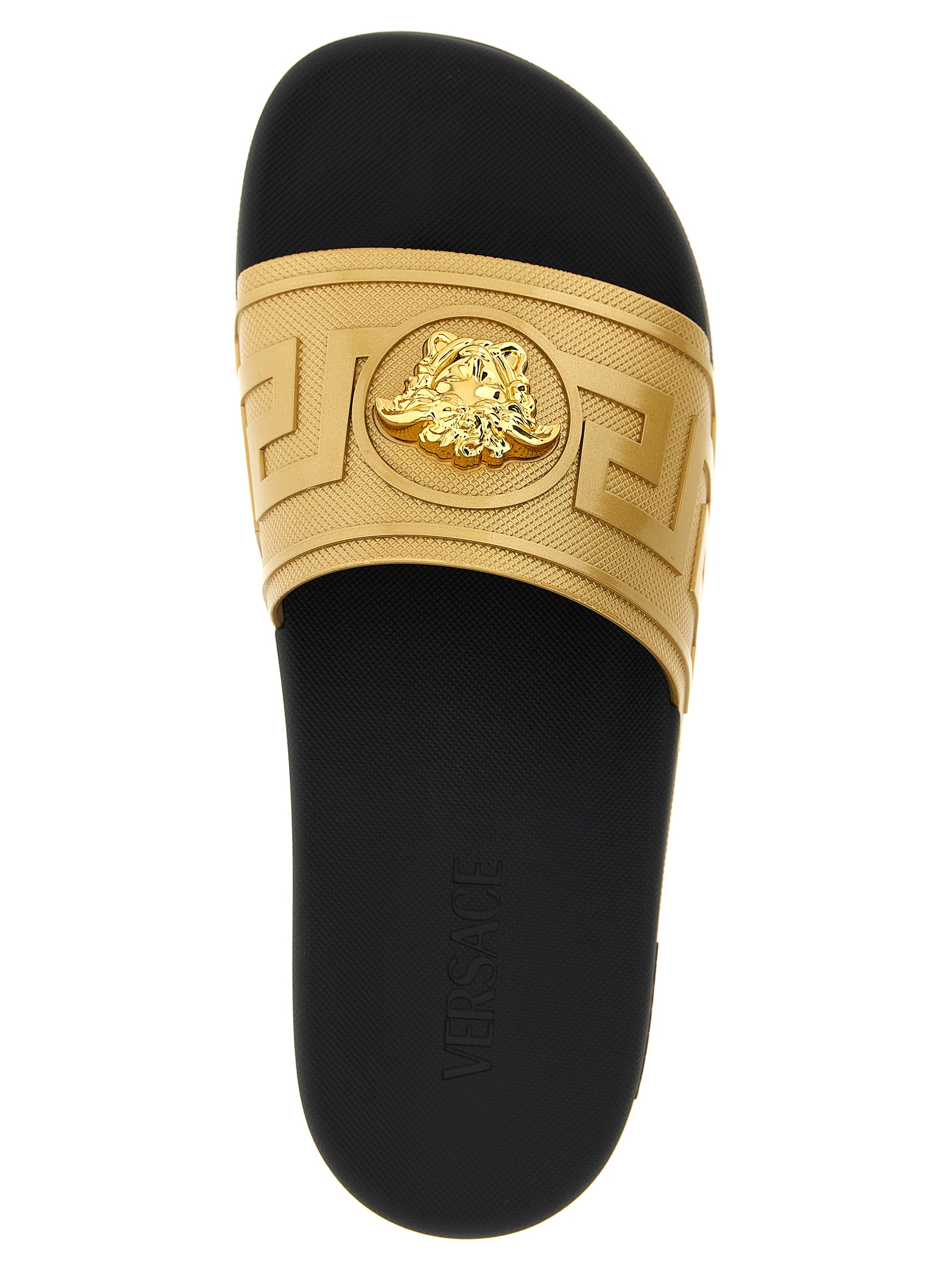 Rubber slides with three-dimensional metal ‘La Medusa’ detail and a Greek pattern on the upper.