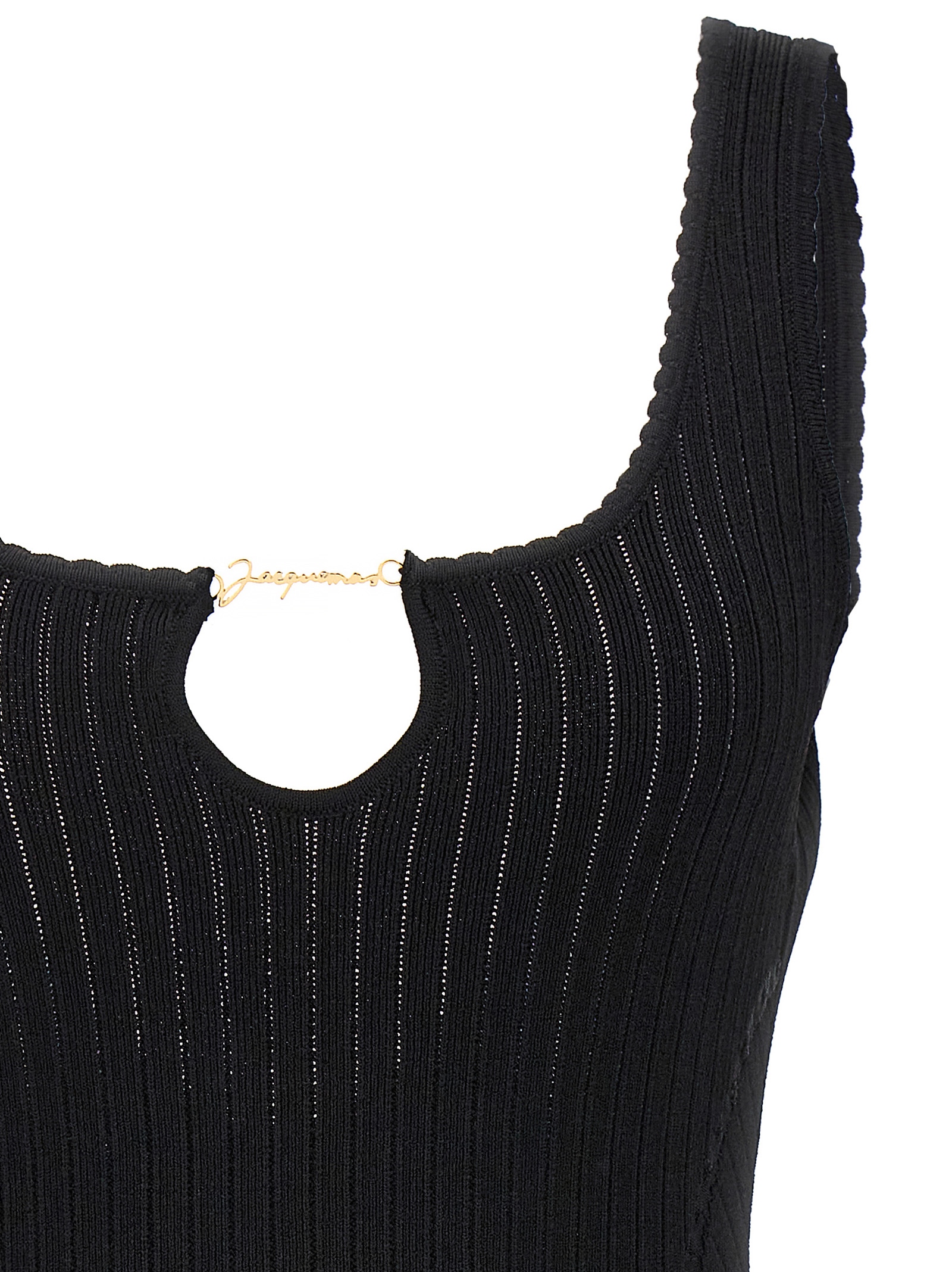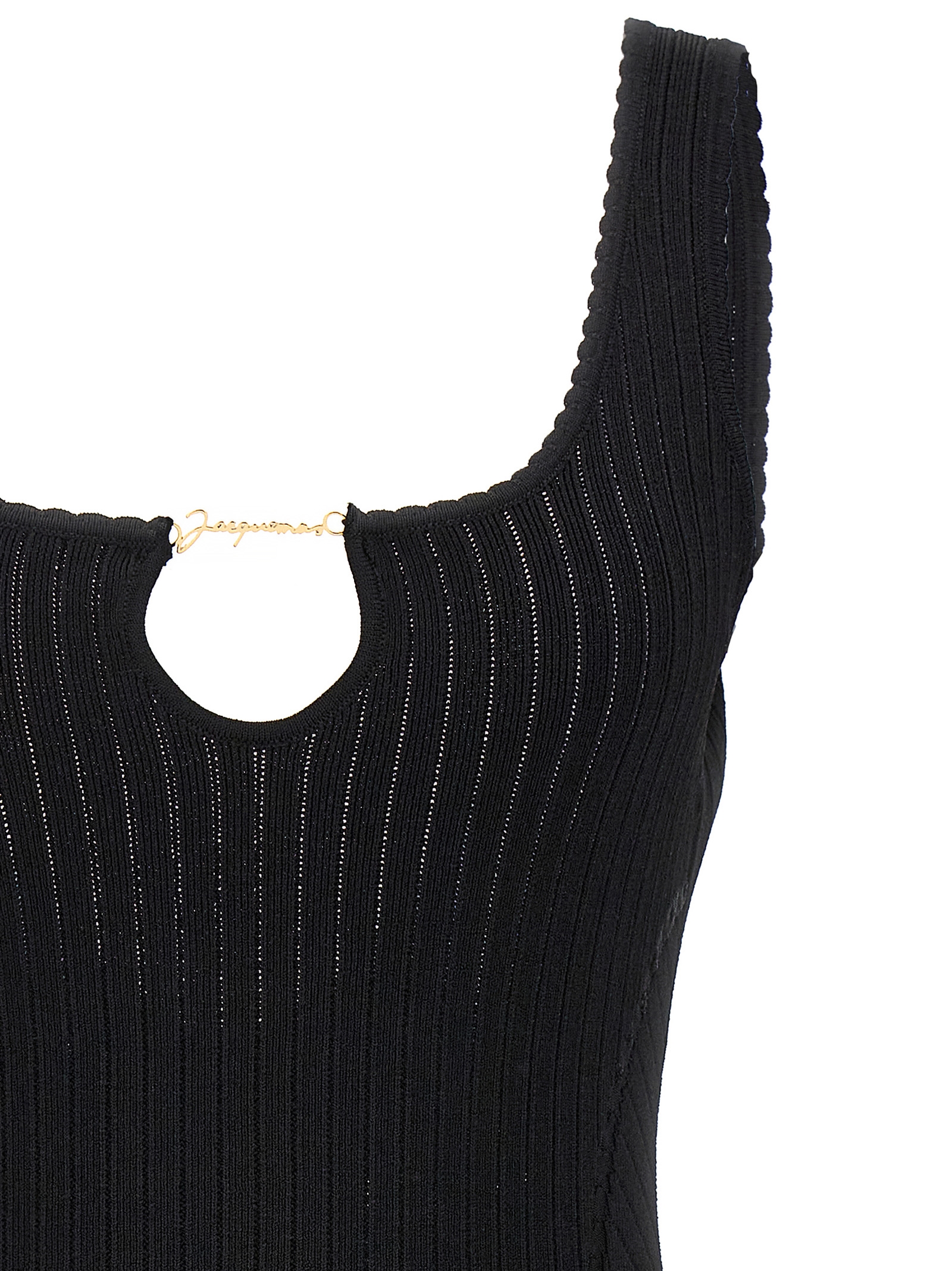 ‘La mini robe Sierra’ dress in ribbed viscose blend with front cut-out detail with gold metal logo charm, sleeveless.