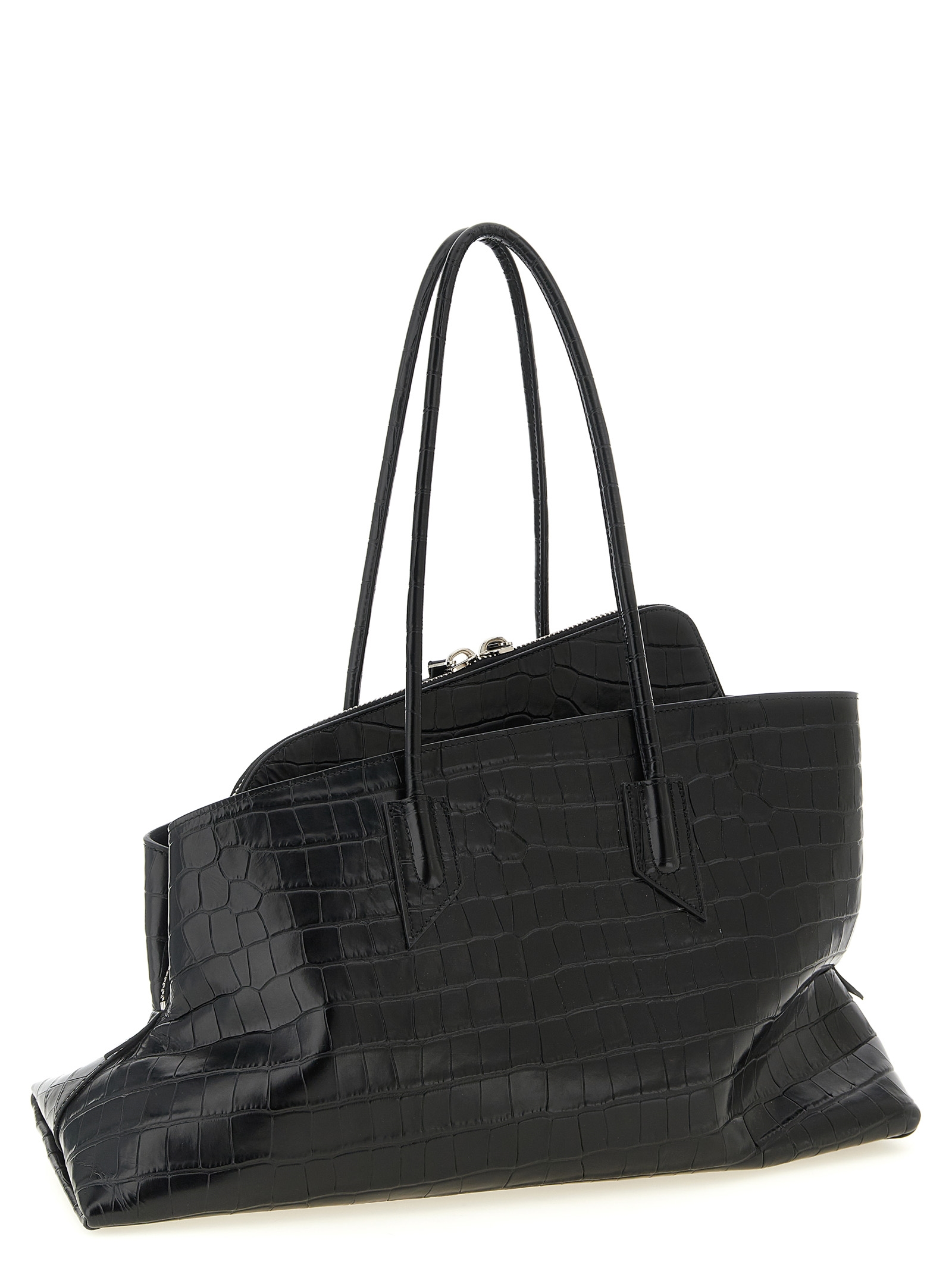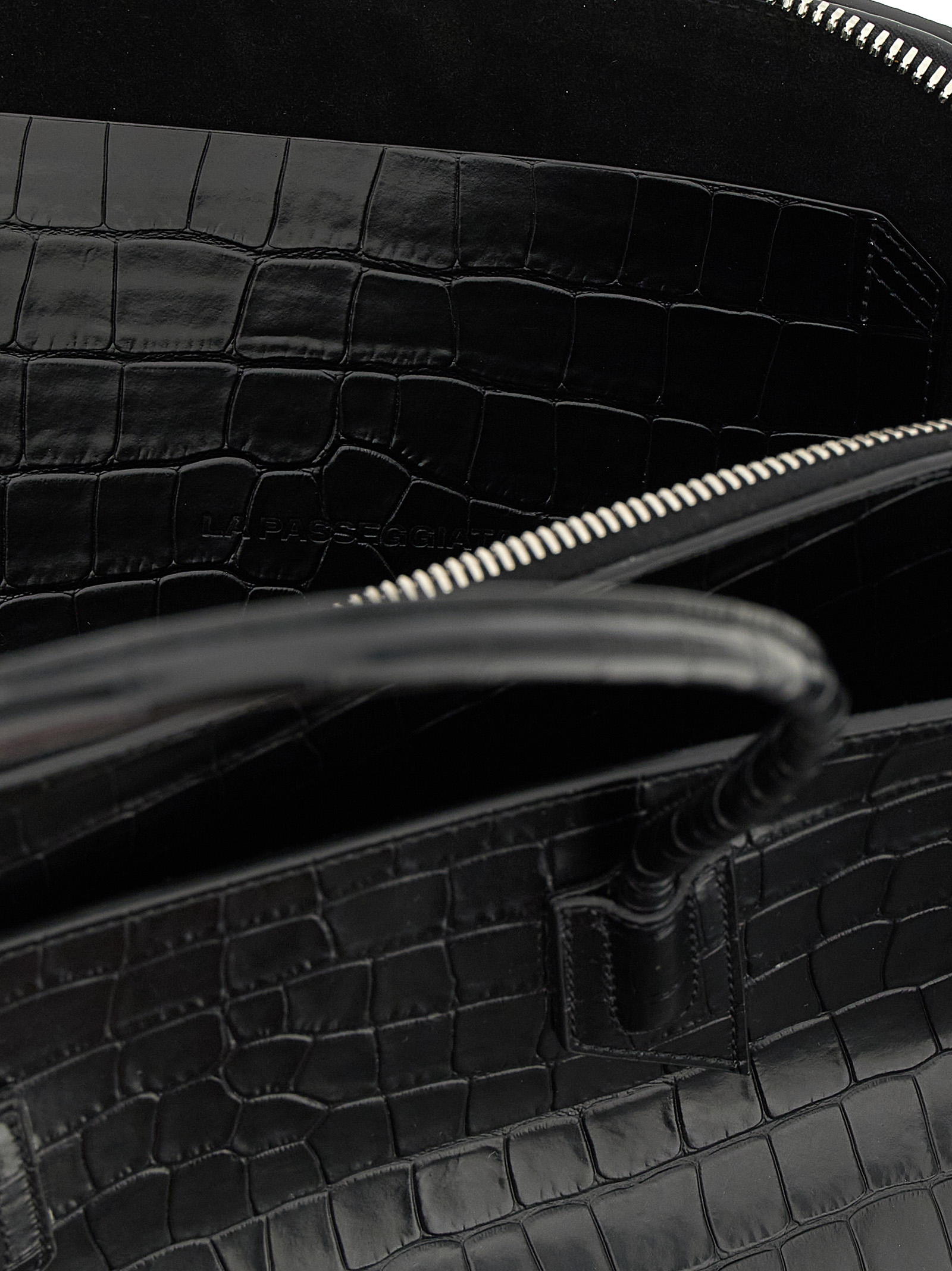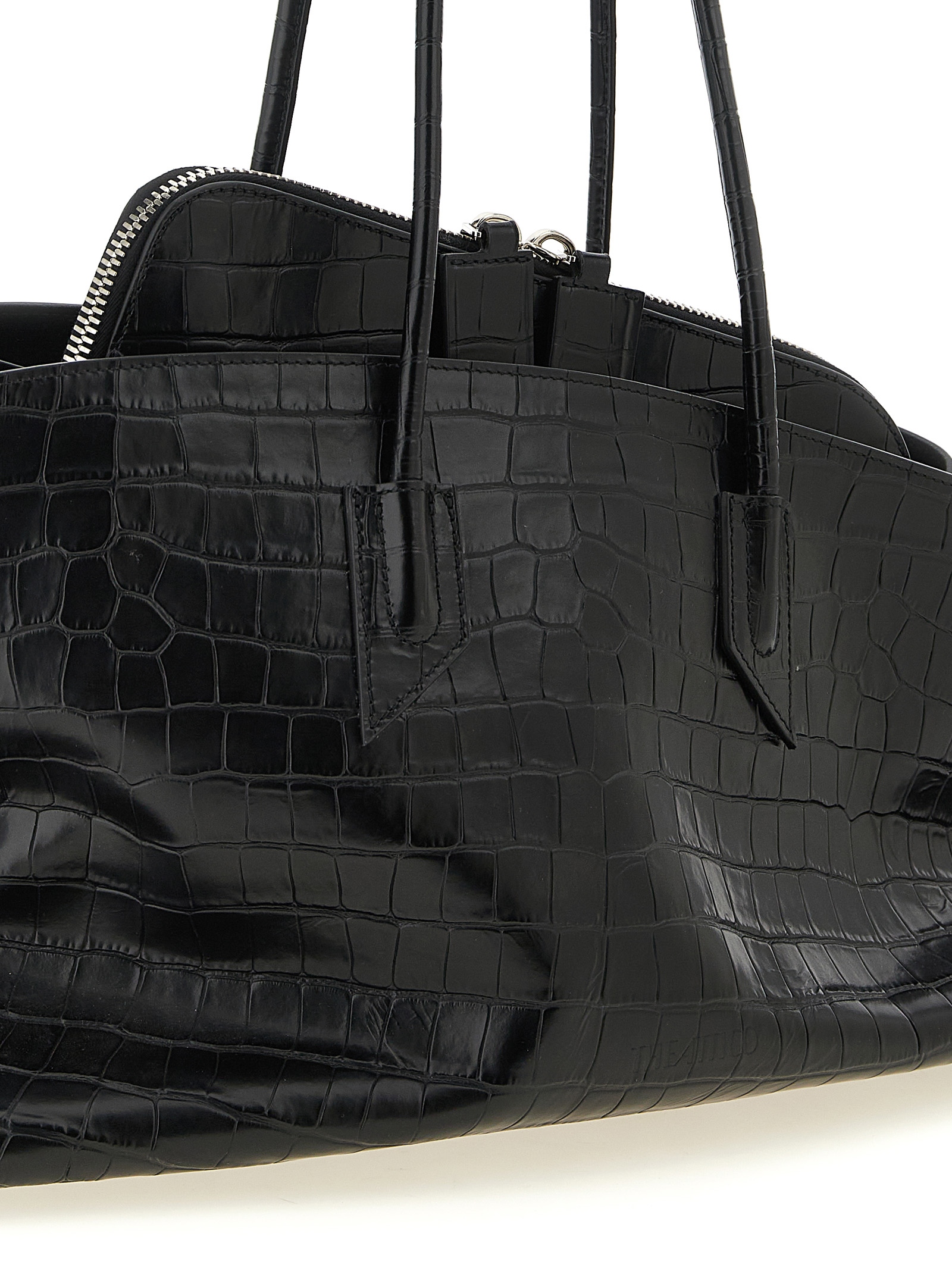 ‘La Passeggiata’ medium shoulder bag in crocodile-print leather, double fixed handle, top zip closure, side pockets, rigid base with metal logo feet.