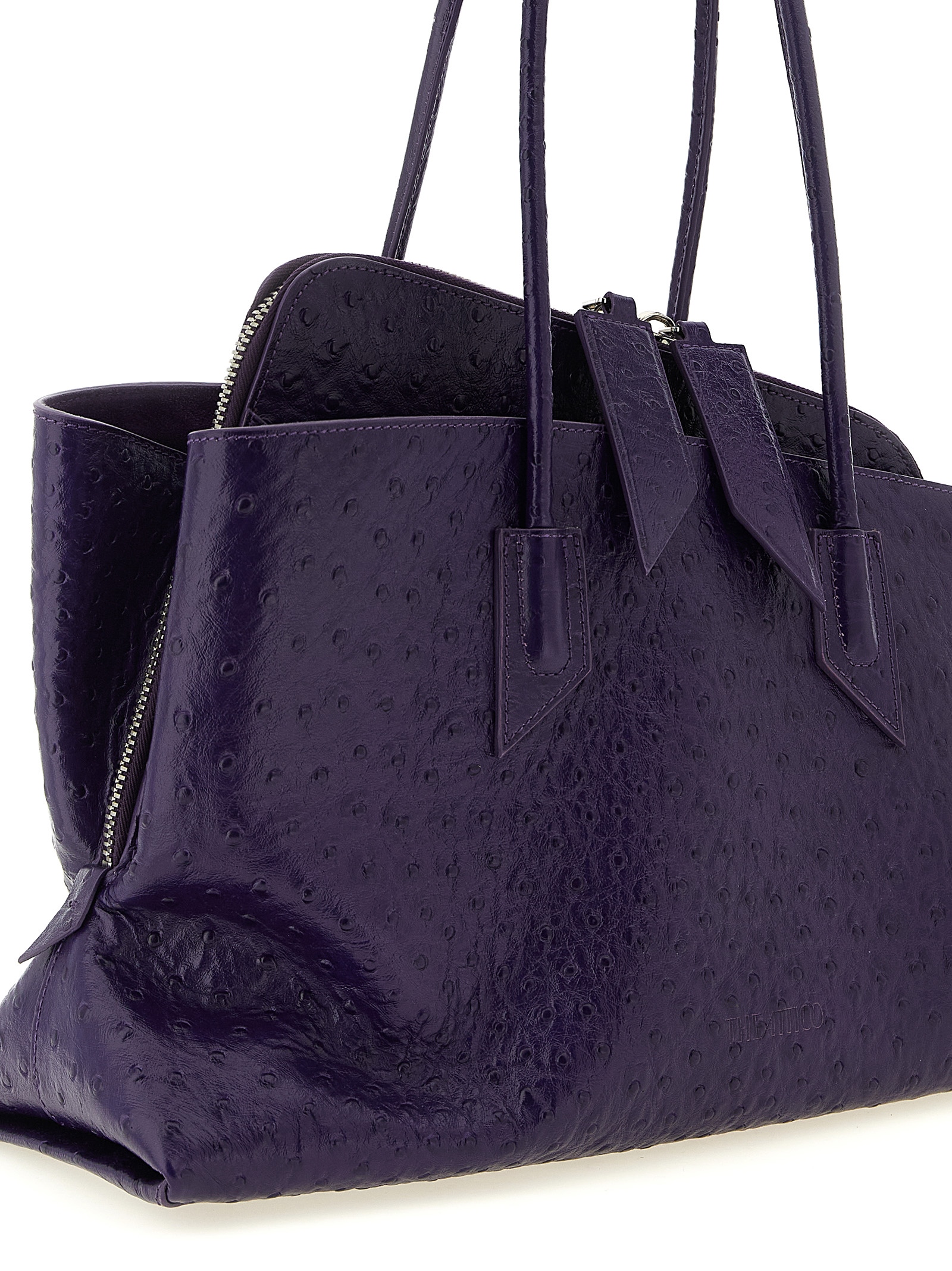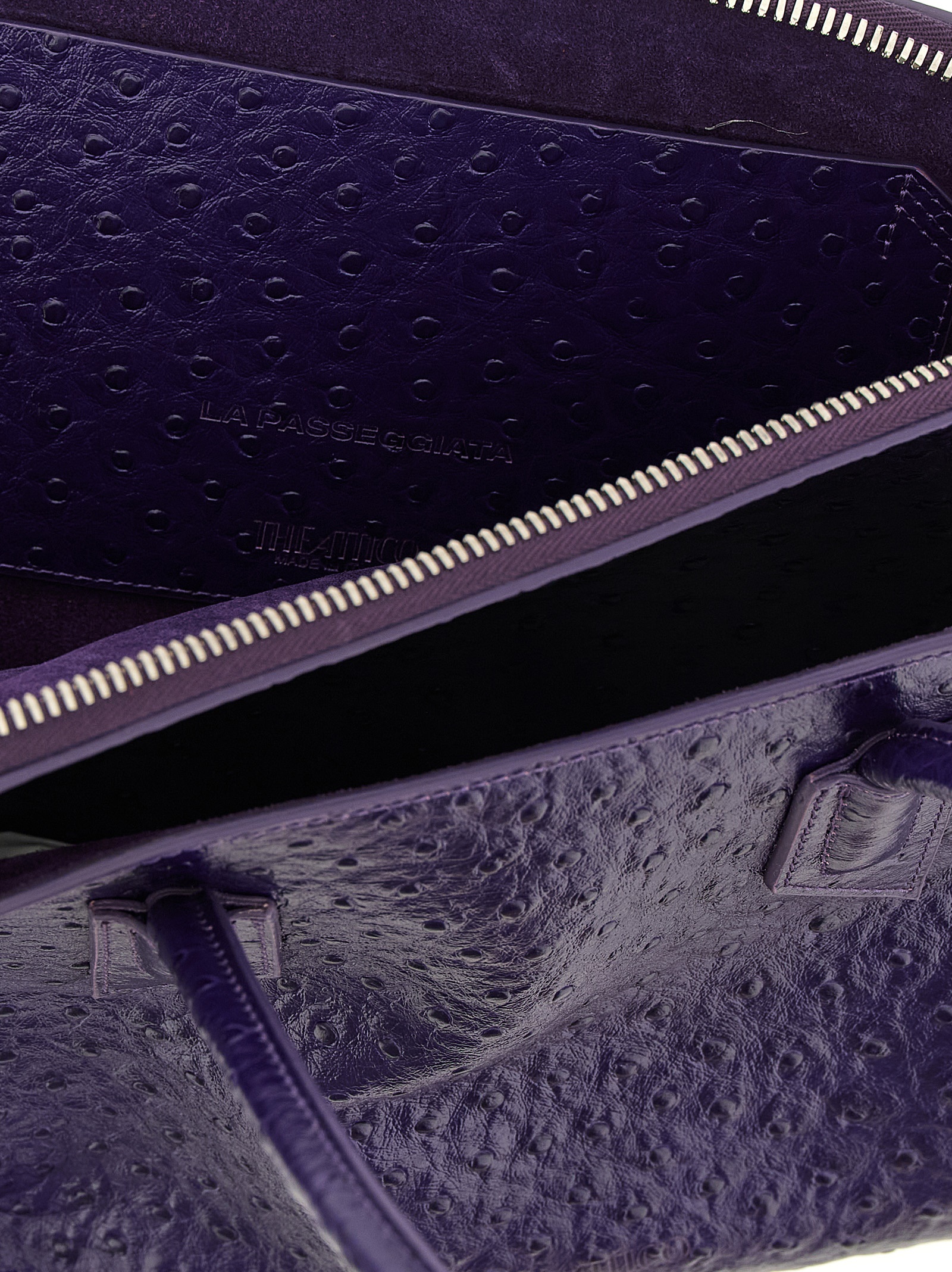 ‘La Passeggiata Medium’ shoulder bag in ostrich print leather with front embossed logo, double fixed tubular handle, top zip closure, side pockets, rigid base with metal logo feet.