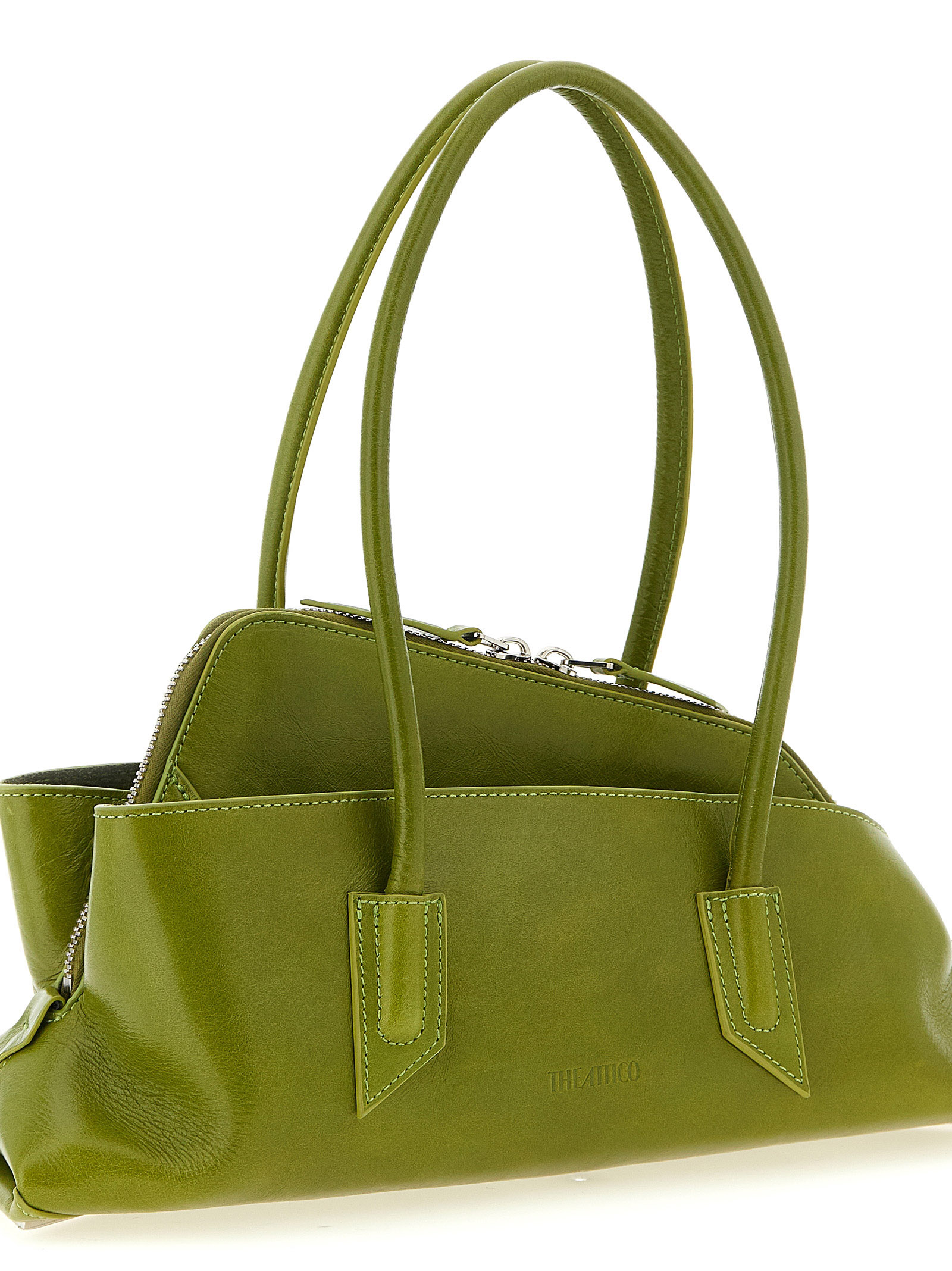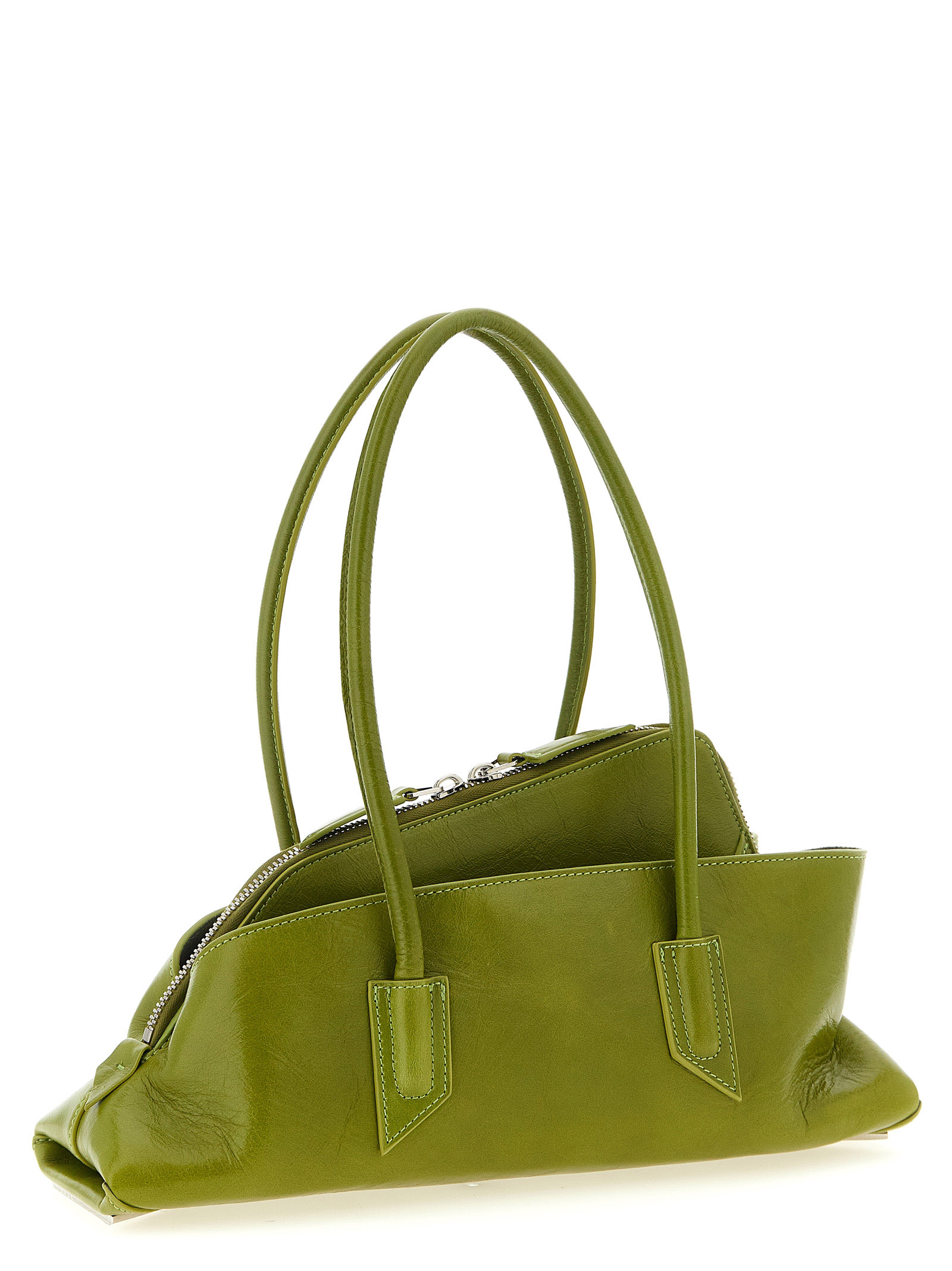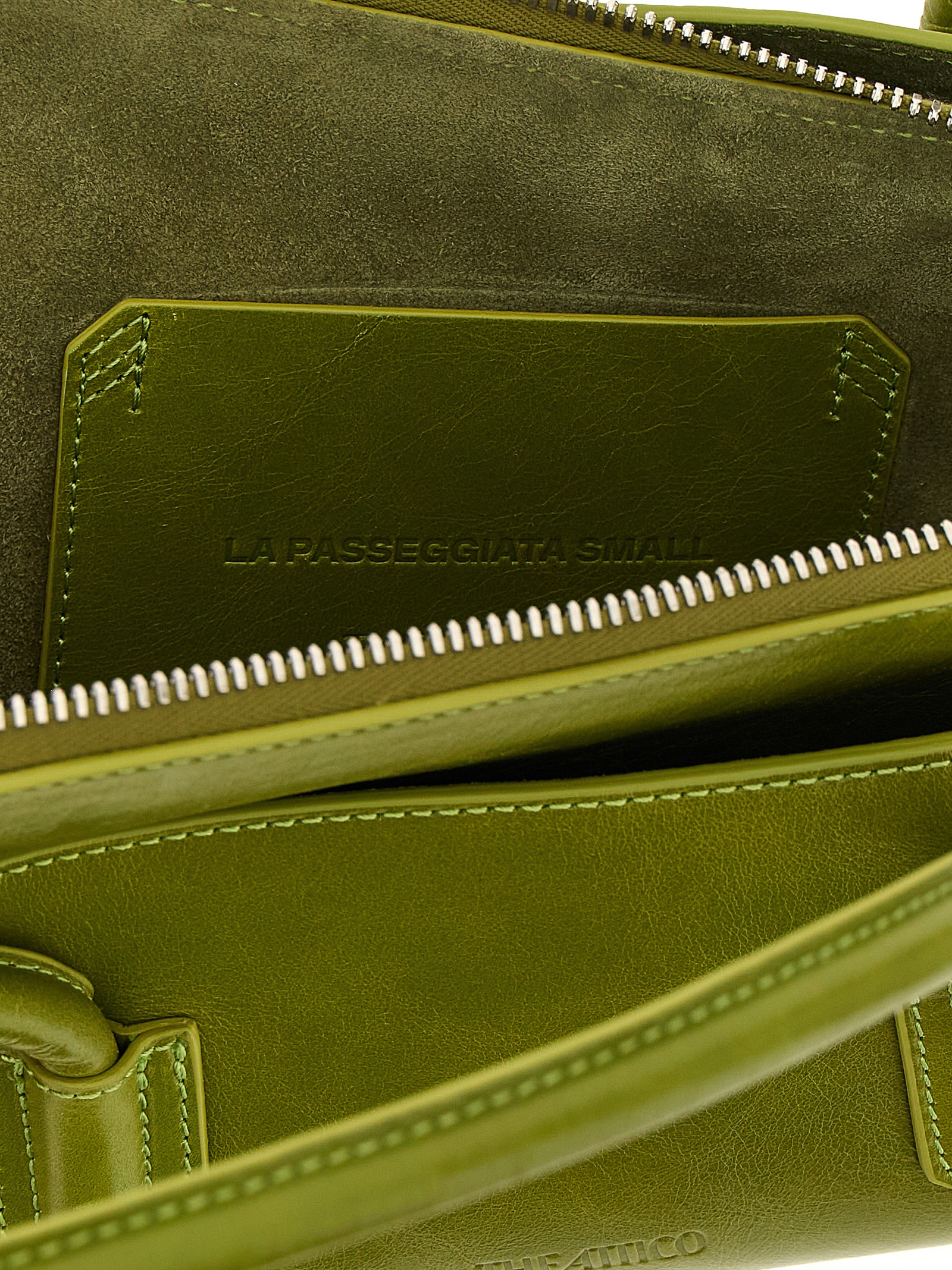 ‘La Passeggiata Small’ crackled leather shoulder bag with front embossed logo, double fixed tubular handle, top zip closure, side pockets, rigid base with metal logo feet.