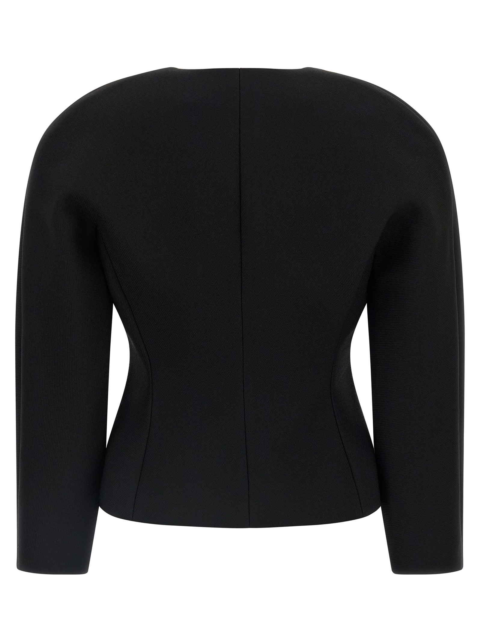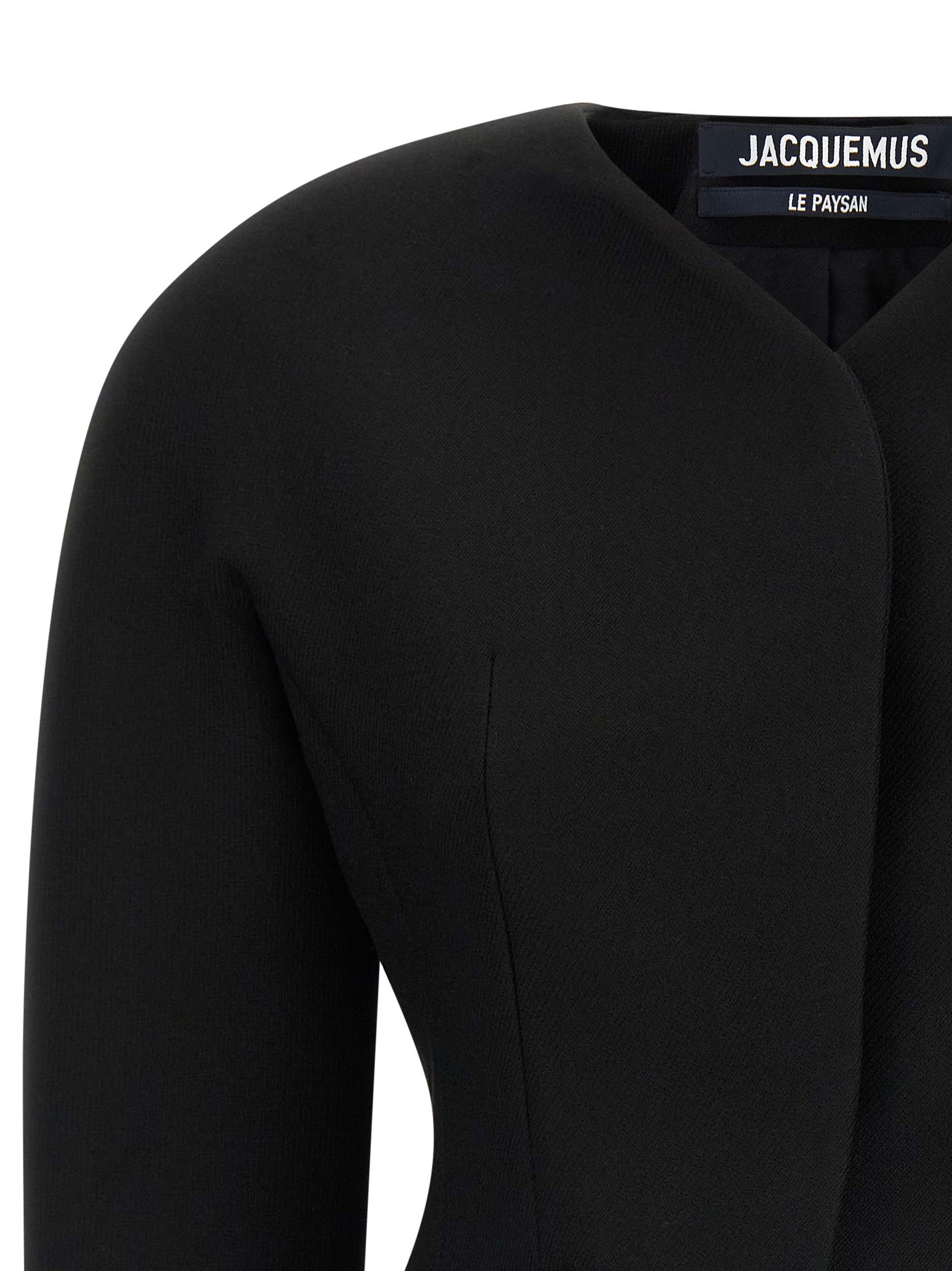 ‘La Petite Veste Ovalo’ doubled tailored wool blazer jacket, crop model, front snap button closure, padded shoulders, long sleeves with a rounded design, pockets, cotton and viscose blend lining.